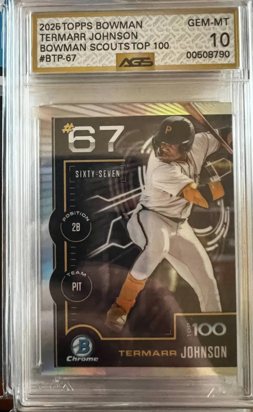 Check out this pristine Termarr Johnson card from the 2025 Topps Bowman Scouts Top 100 series, graded a perfect 10 by AGS. A must-have for any Pirates fan or card collector!