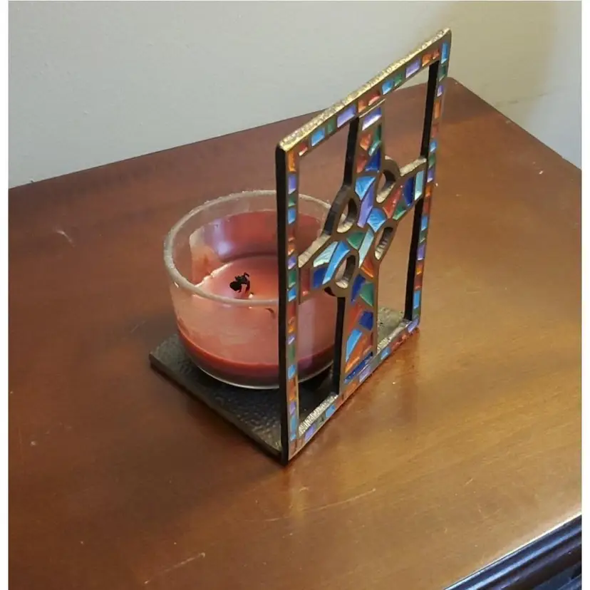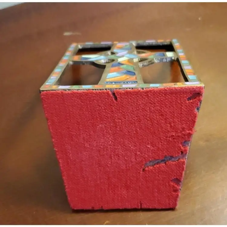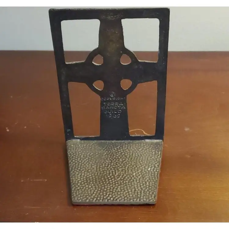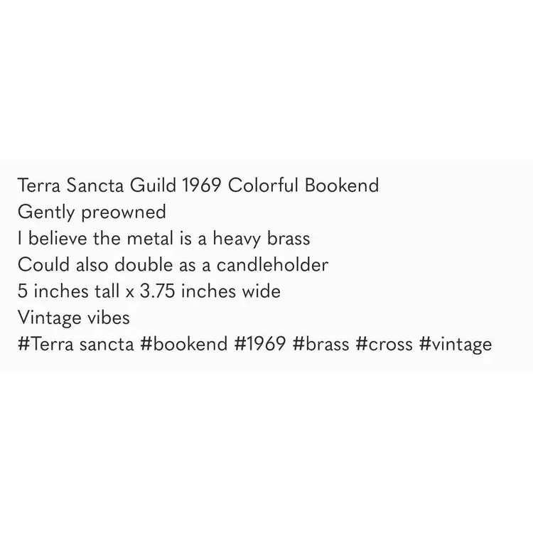 Terra Sancta Guild 1969 Single Cross Bookend Vintage single bookend that could also double as a candleholder Made of metal Colorful 5 x 3.75 inches