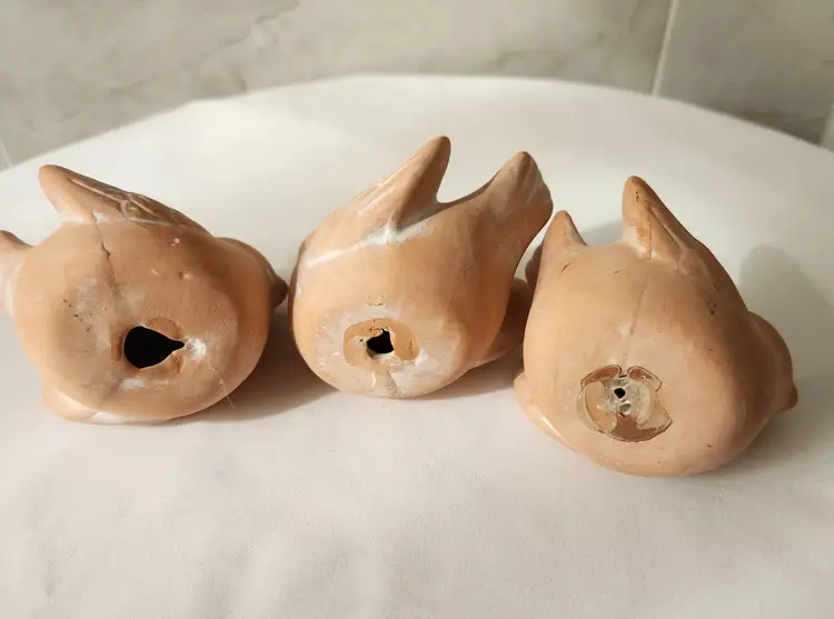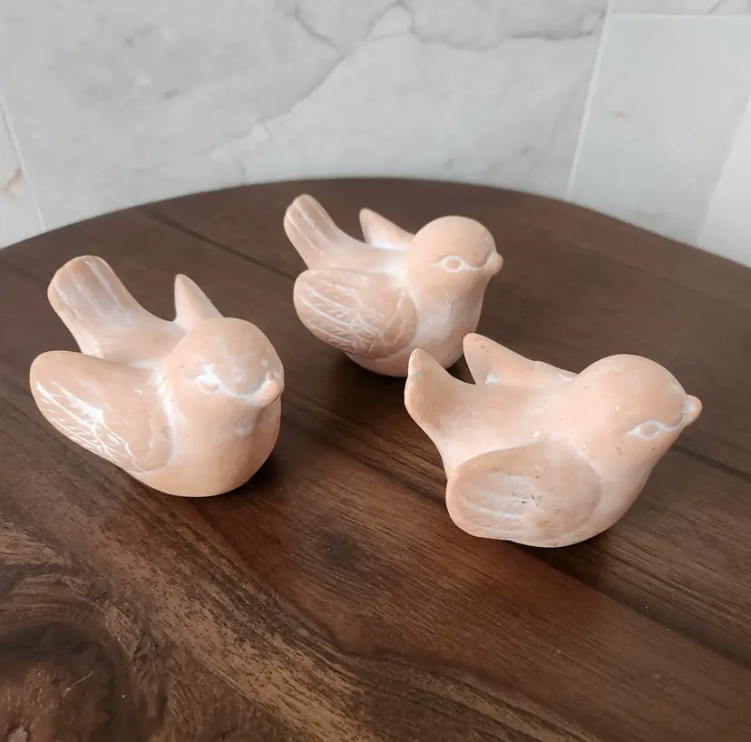 Set of three terracotta birds. They are about 3 inches long and 2 1/4 inches tall. No chips that I can find. One bird has a clear button glued to the bottom. It does not affect how the bird sits. Very Cute