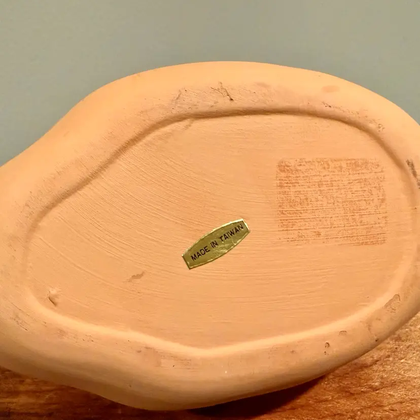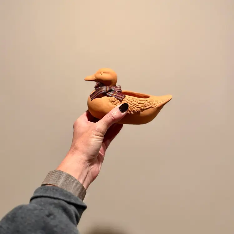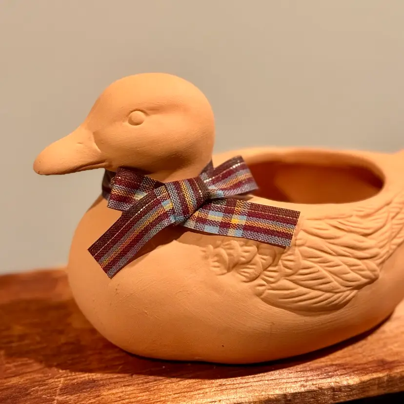 Adorable terracotta duck planter with embossed feather detailing and a little ribbon bow. Perfect for small plants, succulents, dried florals, or as a cute shelf accent. Bottom sticker reads Made in Taiwan. Approx 6.5" long.