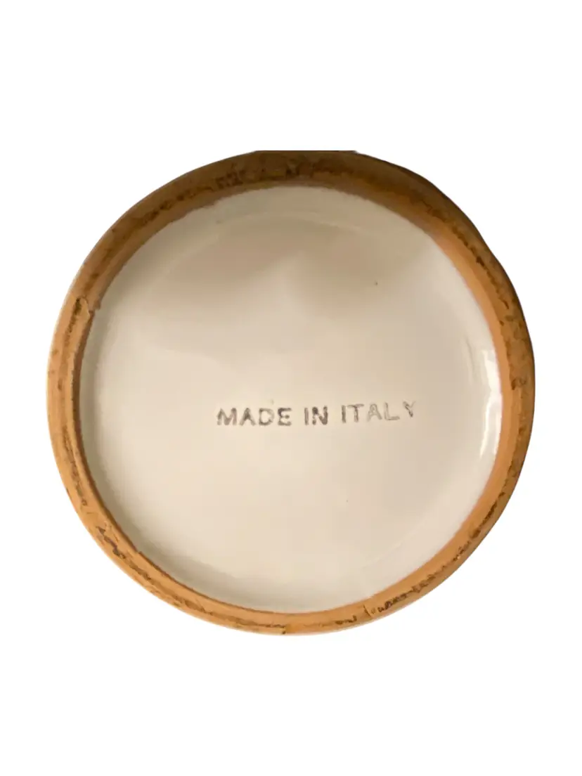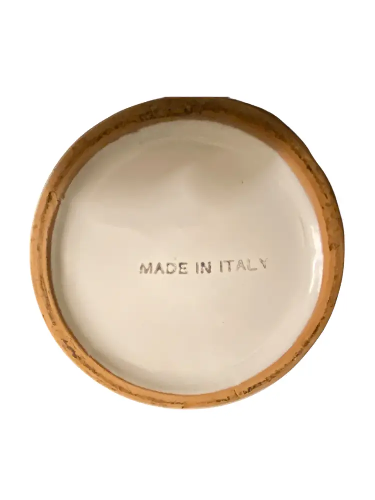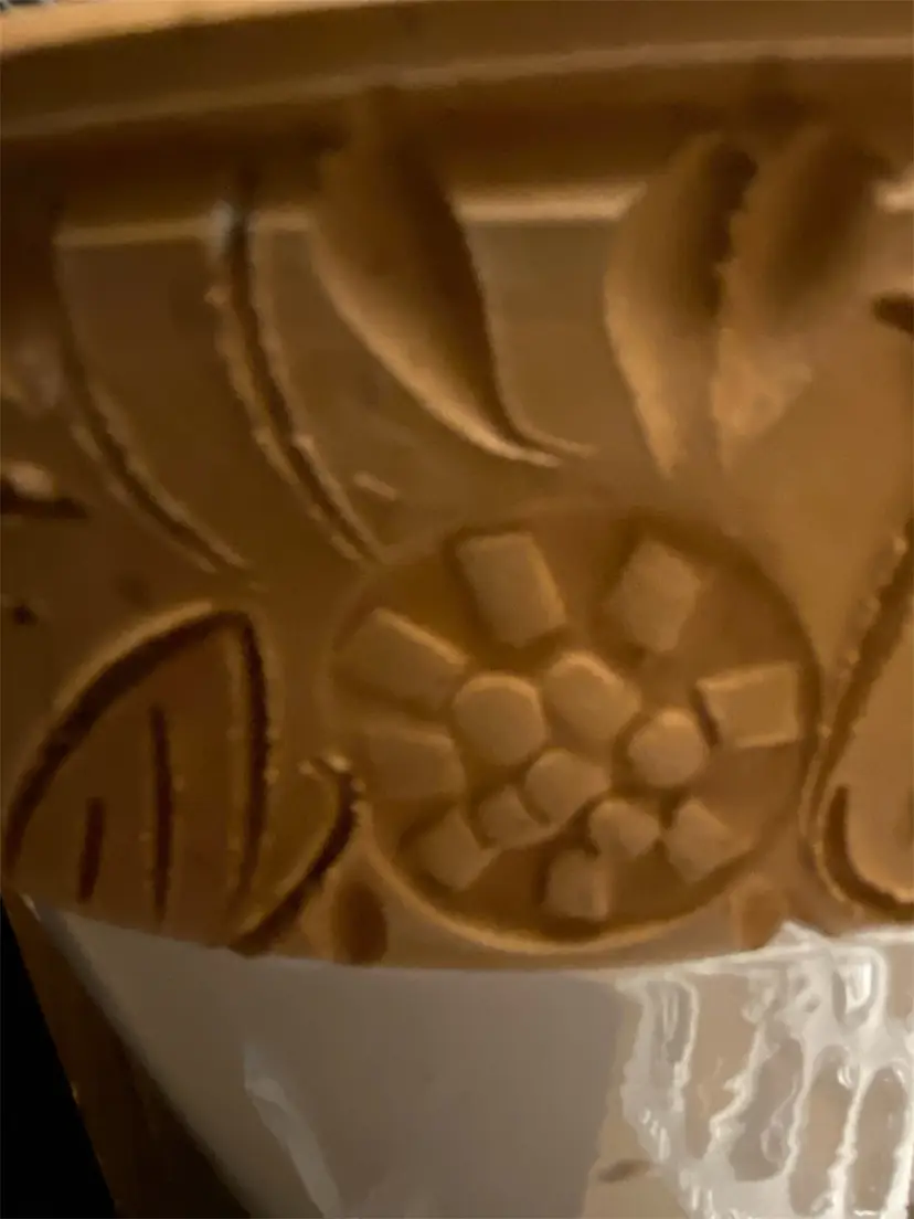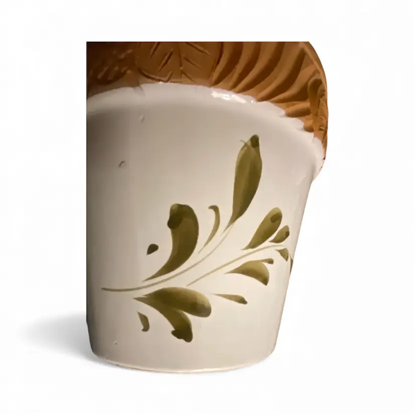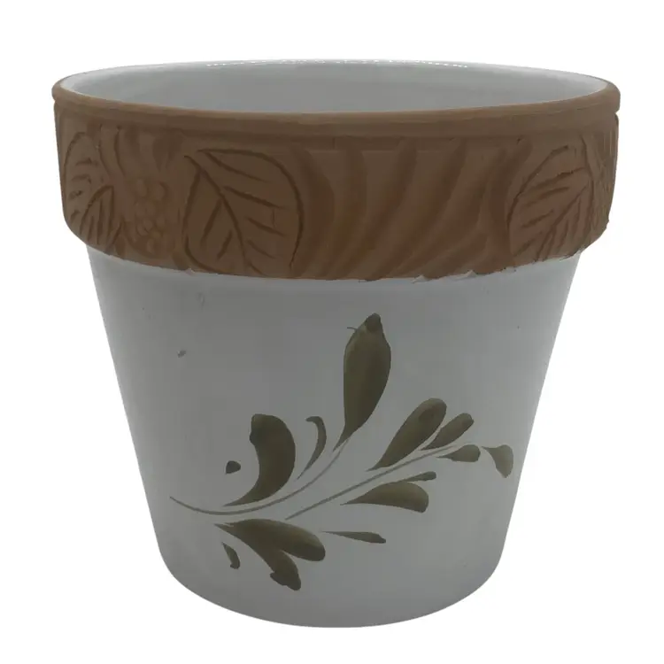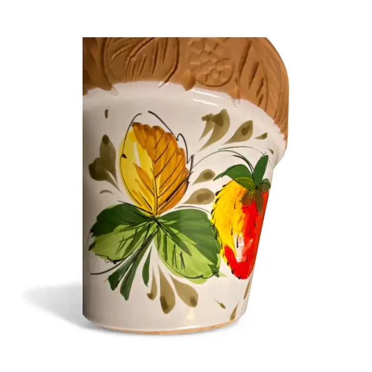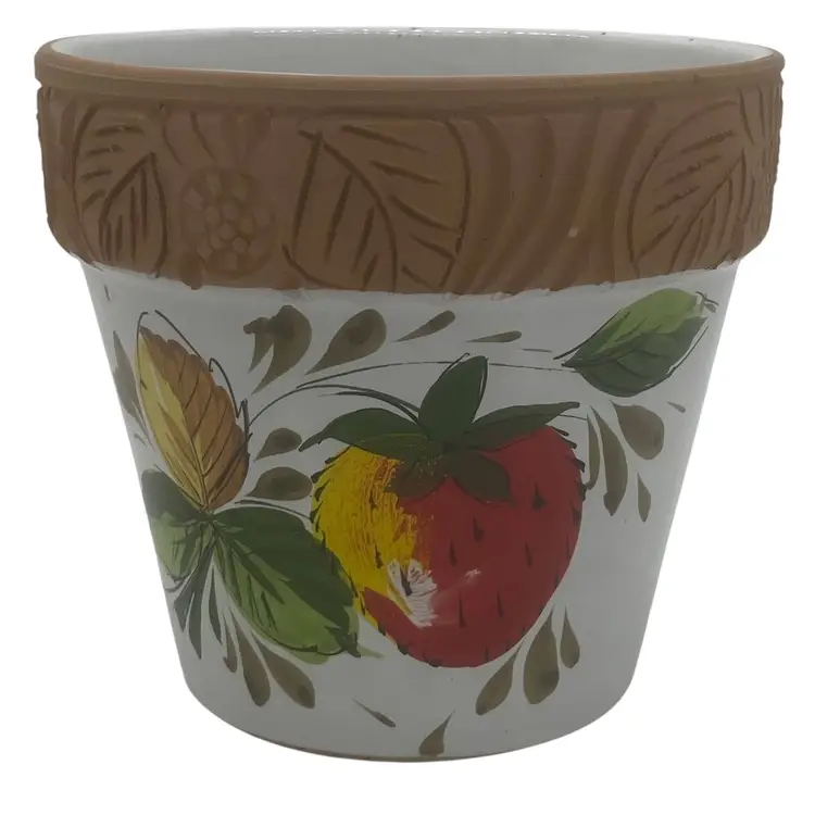 Handpainted Flower Glazed Terracotta Clay Flower Pot 6" diameter x 5 3/4 H Clay Pottery, hand-painted strawberry plant with white glossy glaze and carved design at rim.