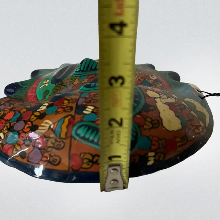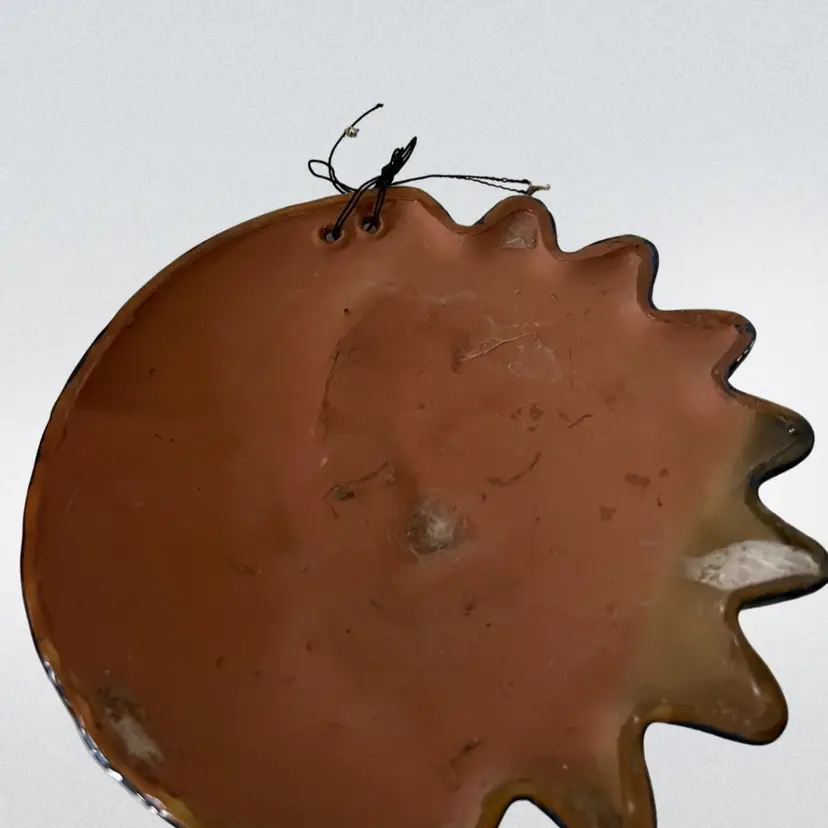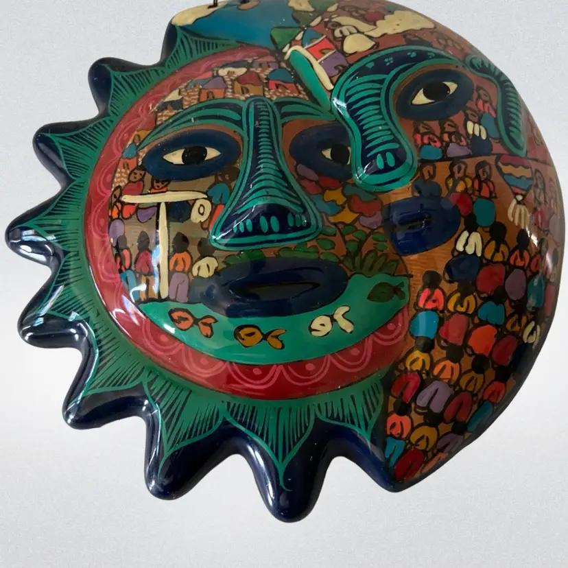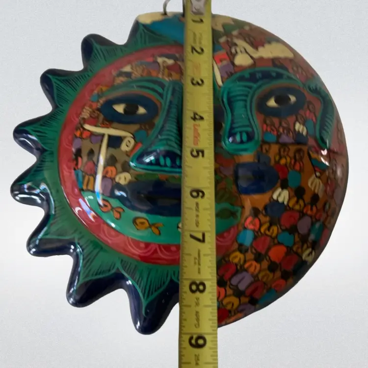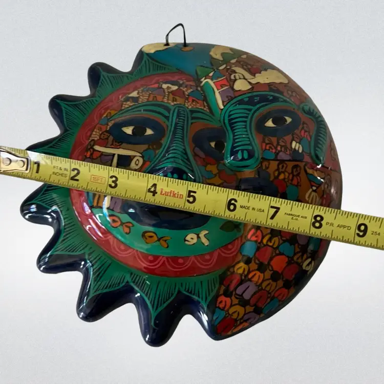 Enhance your home decor with this stunning Terracotta Sun Moon Face Plaque Wall Art. This Mexican Folk Hand Painted piece is a masterpiece that adds a unique touch of culture to your living space. The colors are vibrant and eye-catching, which makes it a perfect addition to your collection of collectibles. The brand is unmarked, and the provenance is unknown. However, this does not diminish the beauty and value of this piece. The craftsmanship is top-notch, and the handmade aspect adds to the authenticity. This piece represents the Mexican culture and adds a touch of elegance to your collection.