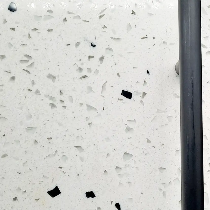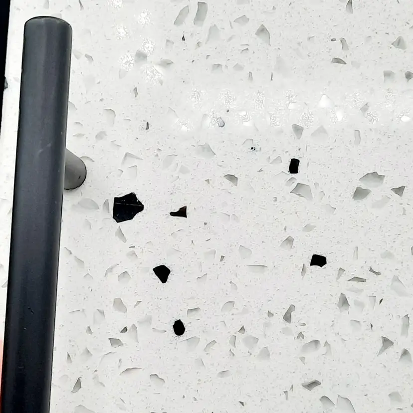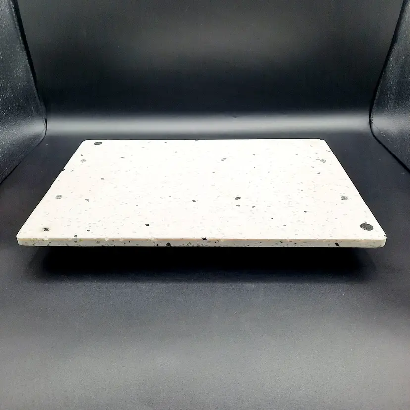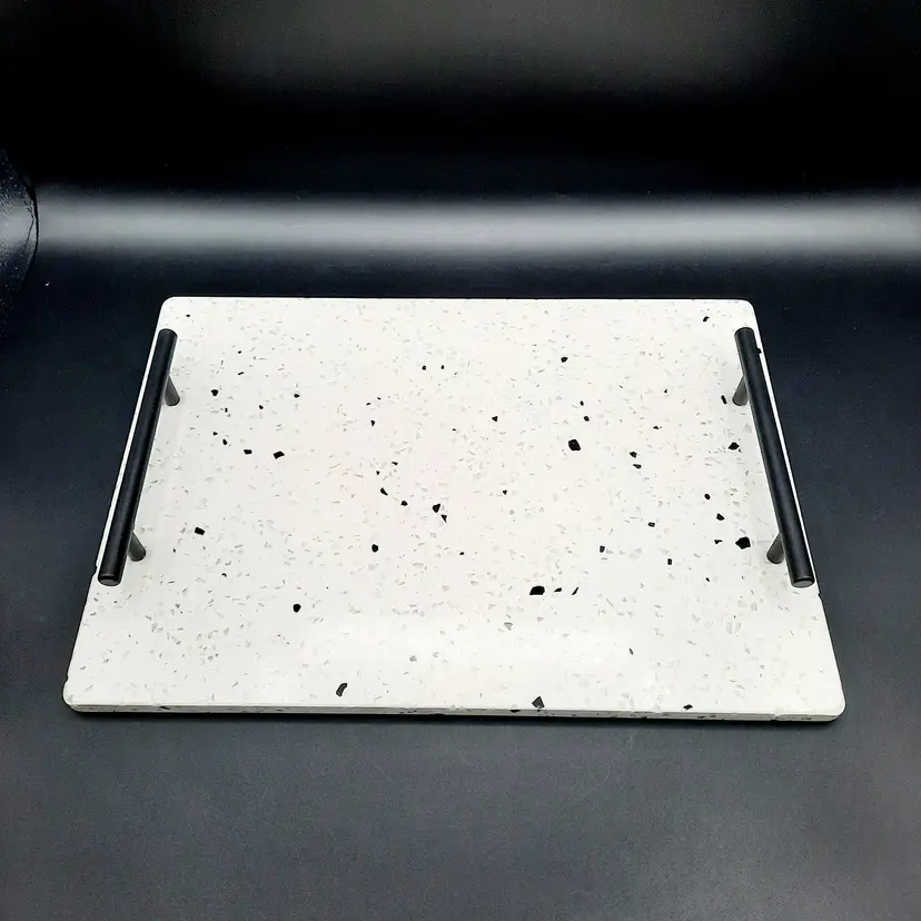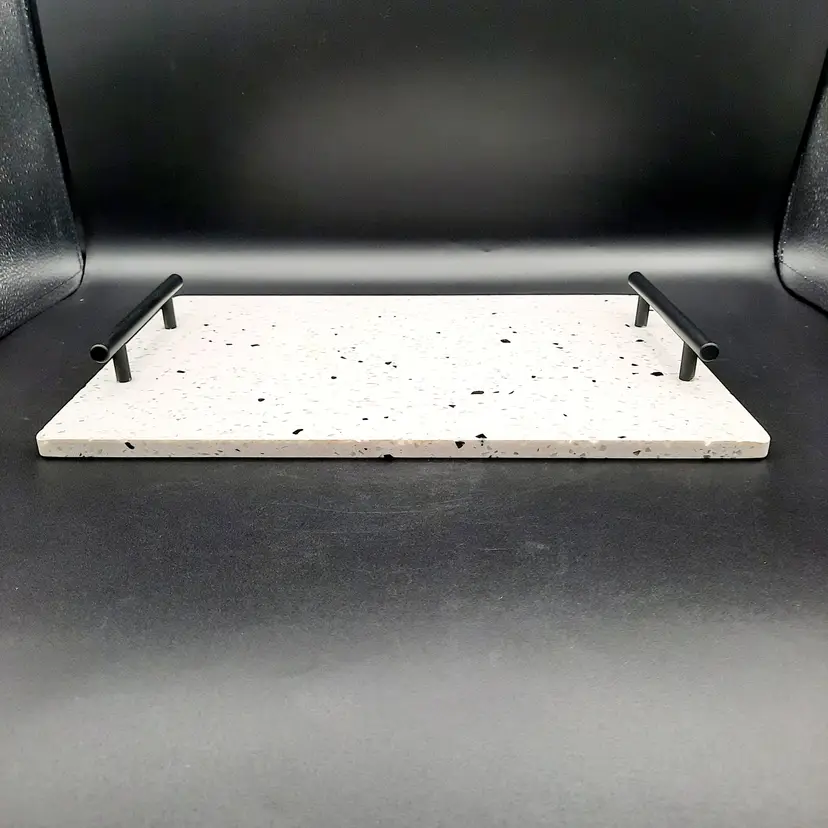 Beautiful tray measures approximately 14" x 10" and weighs almost 5 lbs! In excellent condition with a bit of wear/scuffing on metal handles, looks like it originally had felt feet, a few of which have worn or washed off (the little rubber feet stoppers would probably be better depending on what you are using it for). I did show pics of the edge of the tray, these are not chips, just how the different minerals are combined.