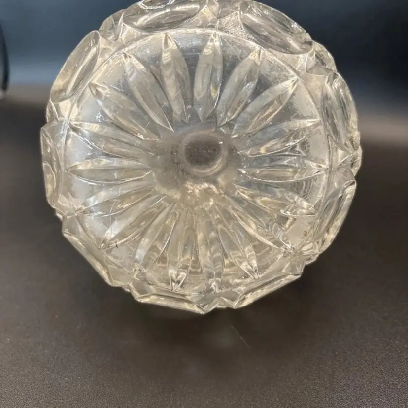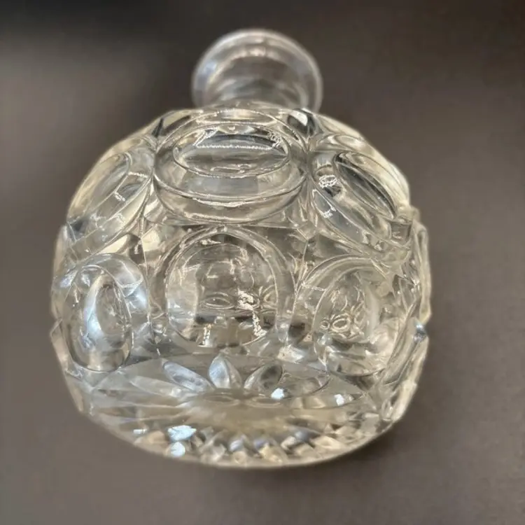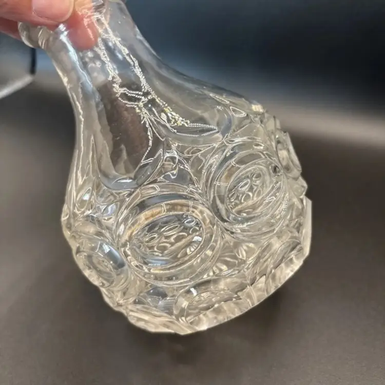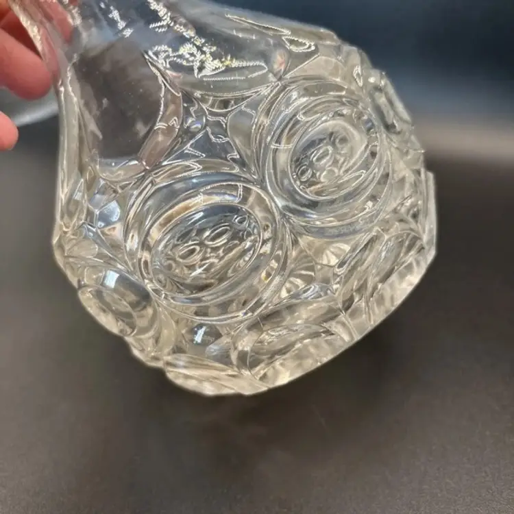 Vintage glass decanter. No stopper. Heavy quality glass. Early American pressed flint glass water bottle that dates circa 1860. Pattern is Texas Bullseye or a variant thereof. It measures 6 3/8" tall x 4 1/2" in diameter at its widest. The wide open neck form of this bottle is most unusual. The condition is excellent. There are no chips, cracks, flakes, hairlines or evidence of grinding.