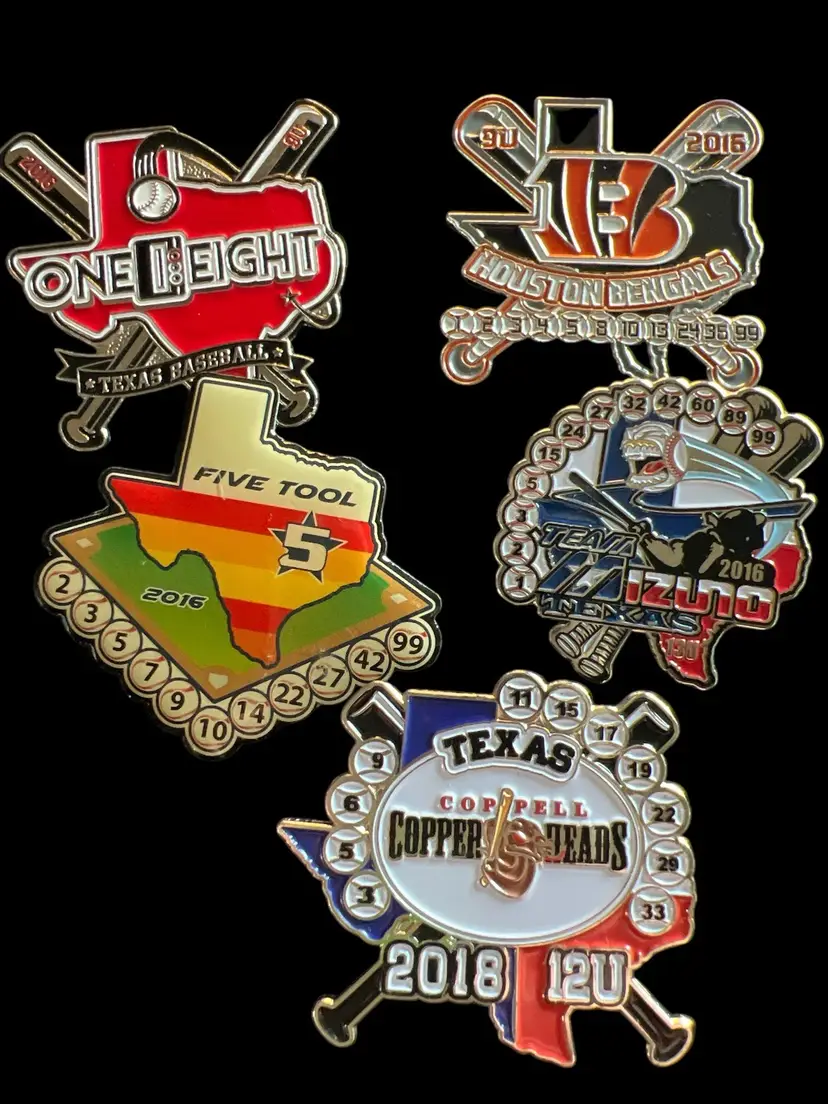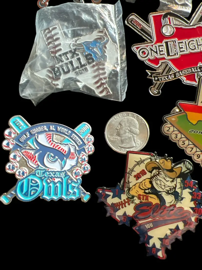 11 Pins, a couple of dupes. See Photos. 2016 , 2018 & ? One Delight Texas Baseball / C0pperheads / Elite / Gulf Shores AL World Series / Five Tool / NTX Bulls / Team Mizuno / Bengals
