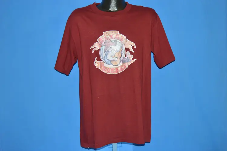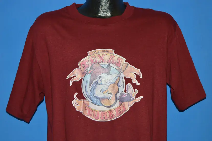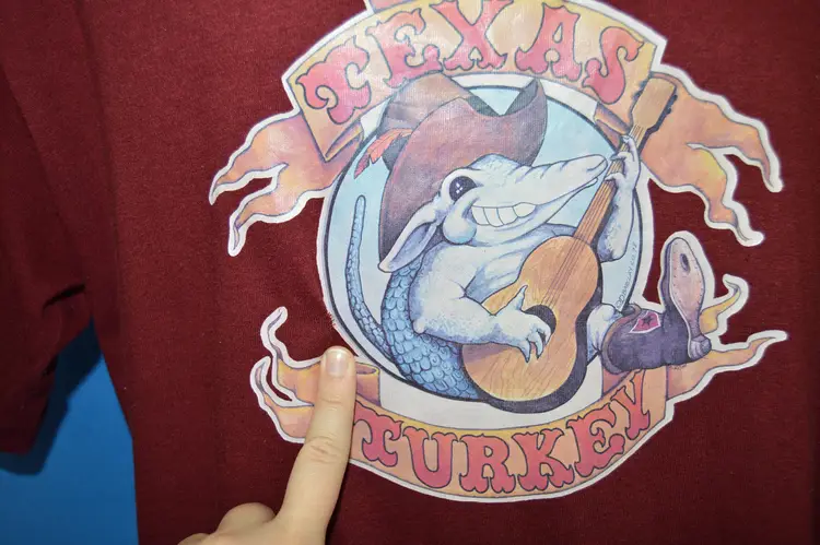 21.5x28, maroon t-shirt from the 80s with an iron on graphic of an armadillo and the caption, "Texas Turkey" Some repairs, see pics