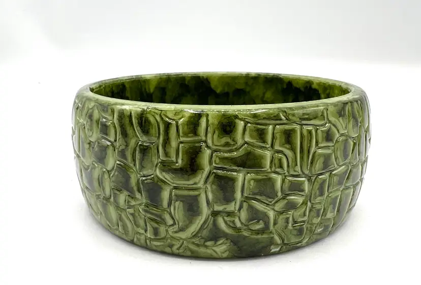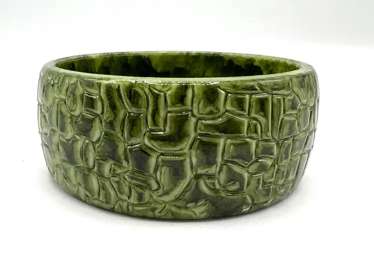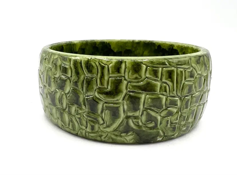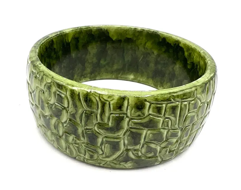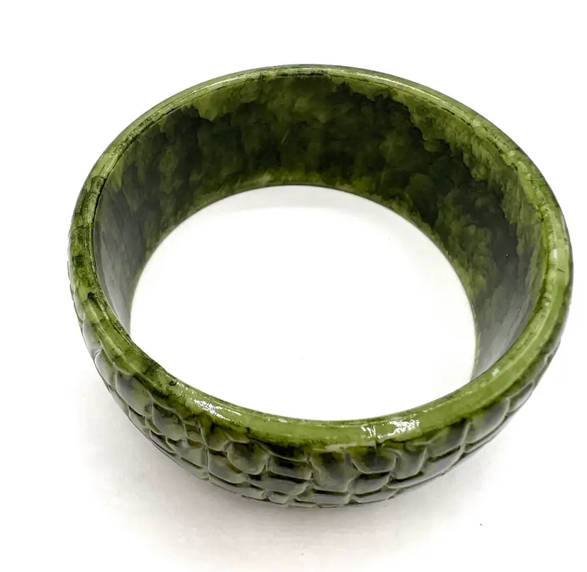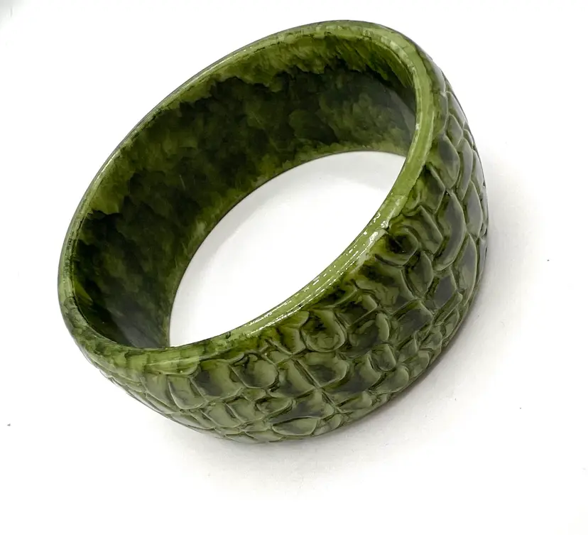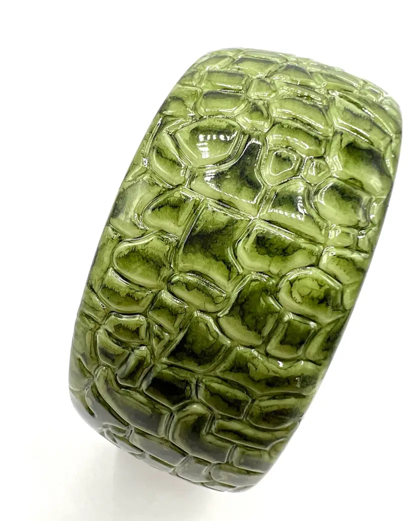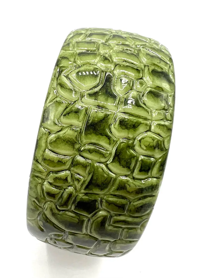 Spectacular groovy wide alligator like plastic thick bangle bracelet featured in a green tone. This bangle is thick, wide, and makes a statement when worn. 2 1/2 inside diameter -1 1/4 inch wide Condition: vintage excellent - Normal wear as with age.