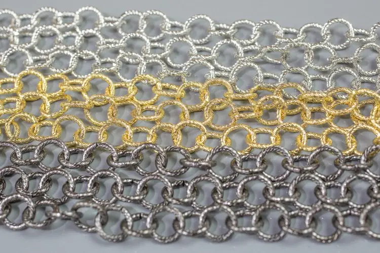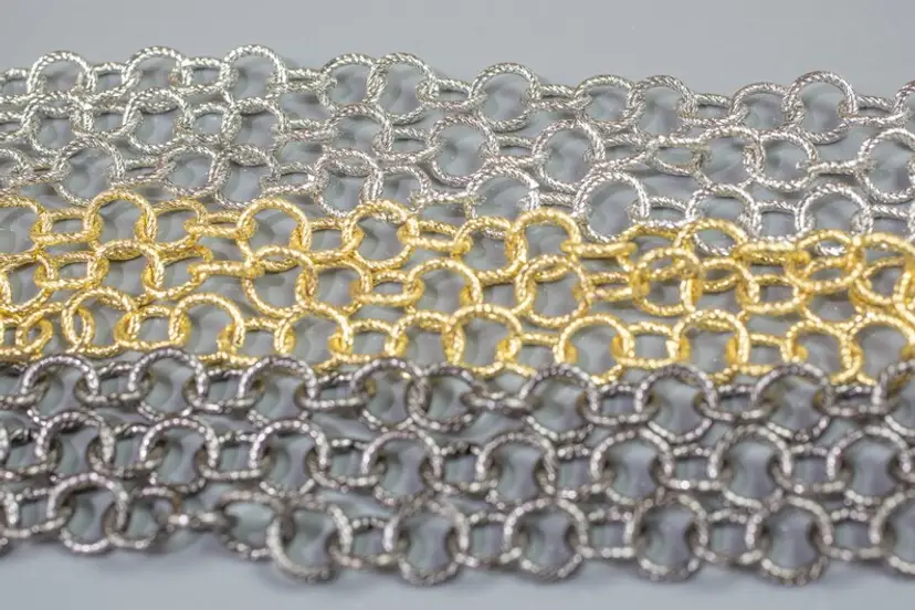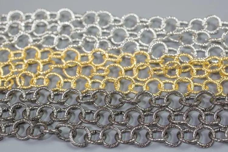 This is a very pretty texturized chain for hanging pendants or making bracelets. There are 2 sizes available. Both sizes look nice draped on the neck. Sold by 30 feet rolls.