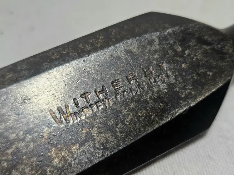 As-found condition, needs to be flattened and sharpened. The edge will clean up nicely, no major issues. 14-1/2 inch overall length. Crisp Witherby Winsted Conn USA stamp. High quality tool from one of the premiere edge tool makers of the time.