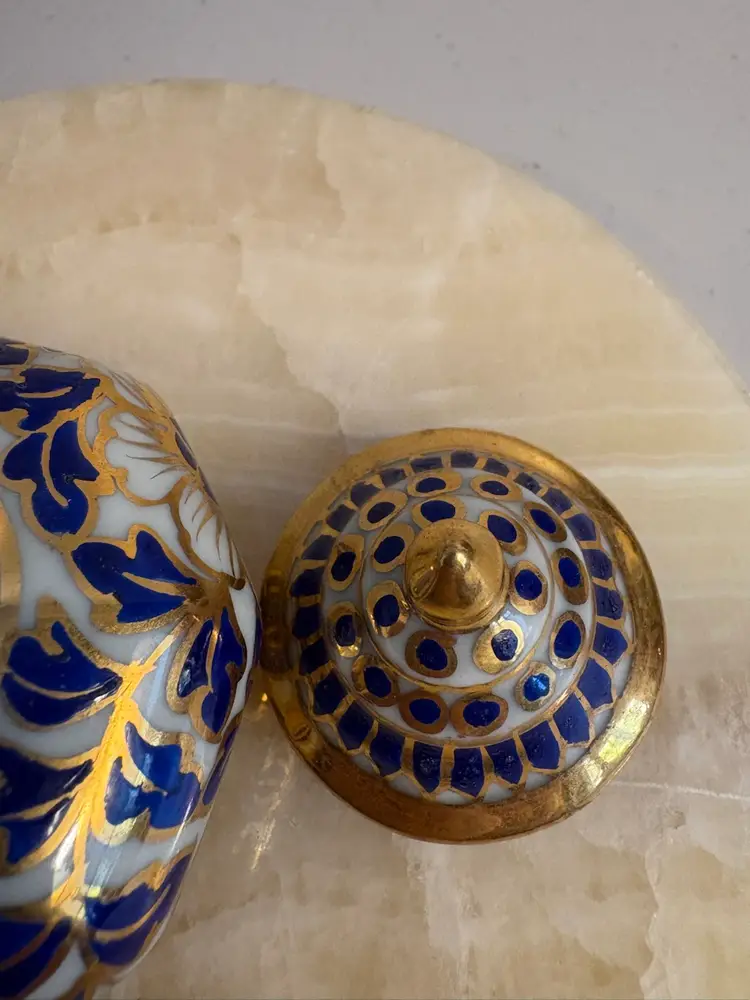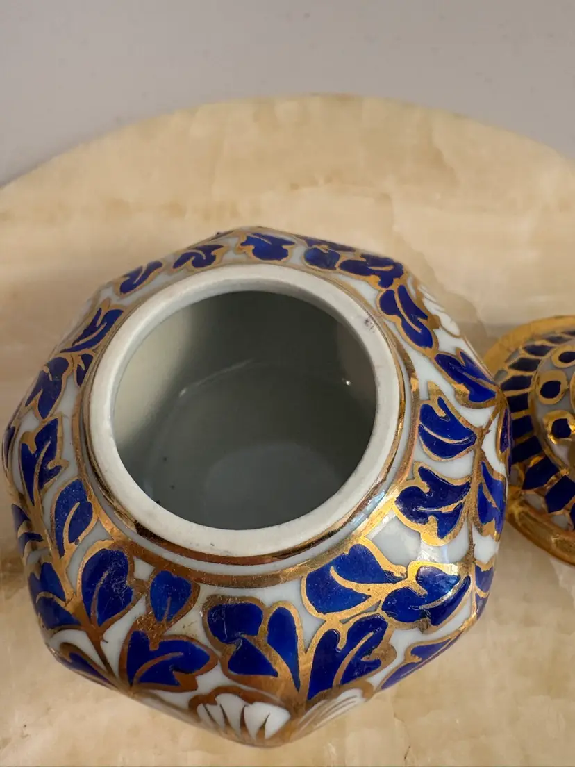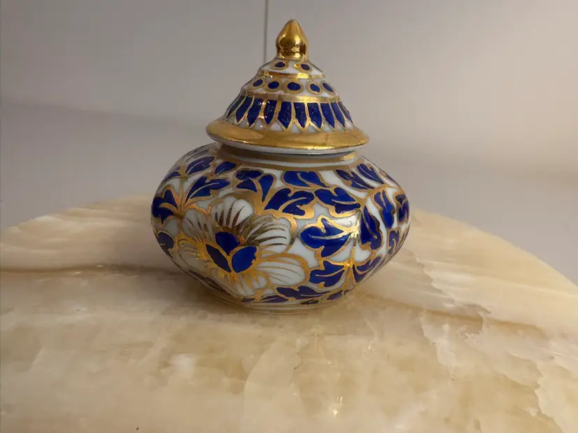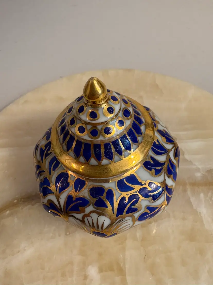 Vintage Thai Benjarong Porcelain Lidded Jar, Ginger Jar, Decorative Jar, Blue Lotus Flowers Gold Trim