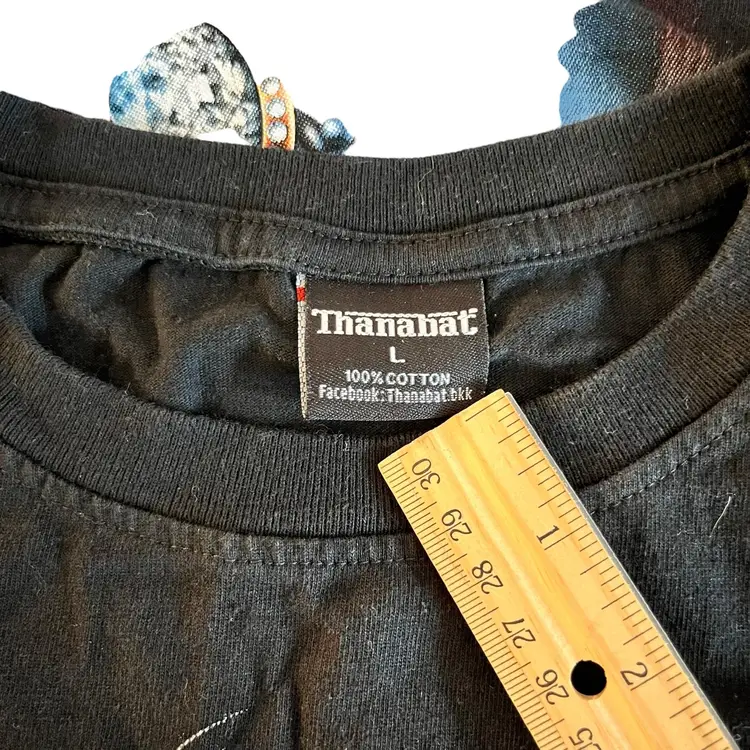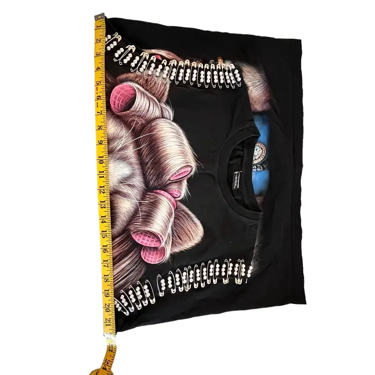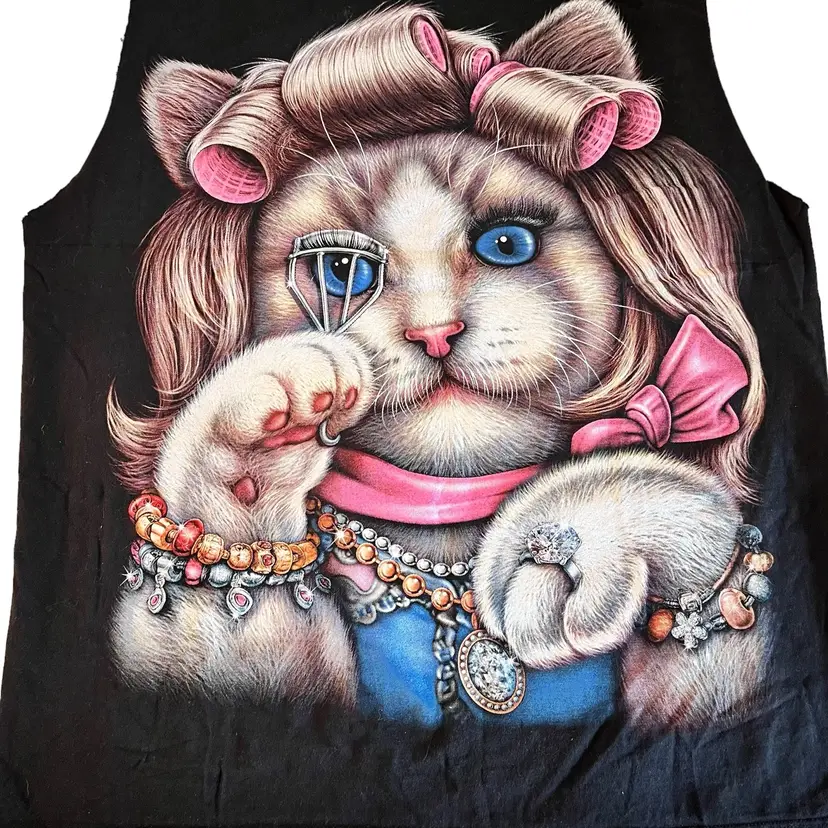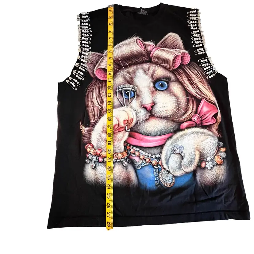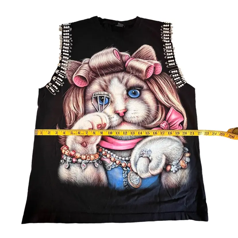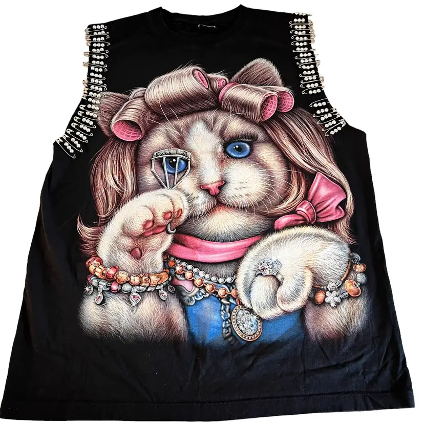 Indescribably unique and funky Thanabat Glam Cat Sleeveless T-Shirt Embellished With Silver Beads on Safety Pins around Front of Arm and Accents of Glitter on Ms. Glam Cat herself. This is a pre-owned item in excellent condition.