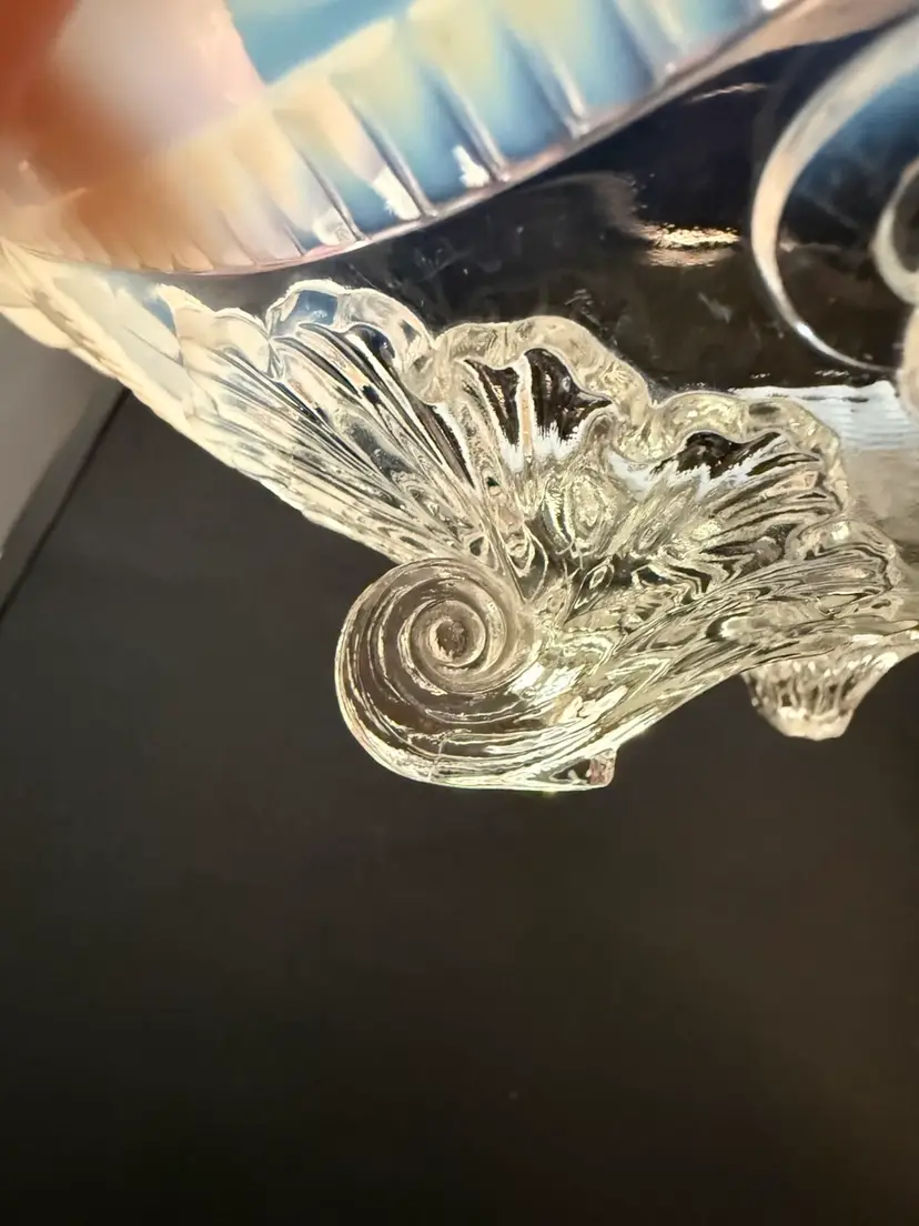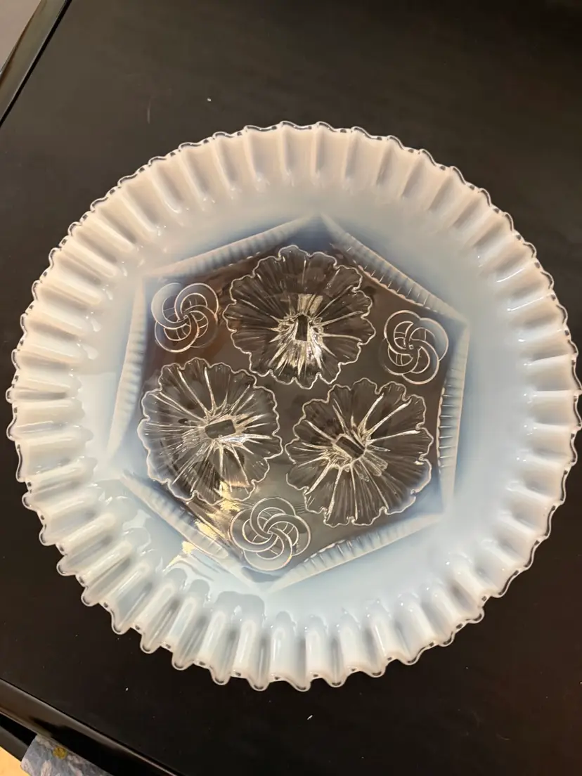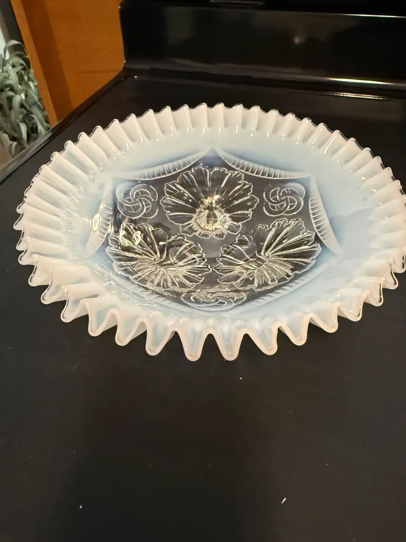This is an antique Northwood Glass "Ruffles and Rings" white opalescent bowl. It is a footed candy dish or master berry bowl with a ruffled edge and it has clear glass “rings” and pressed floral designs.