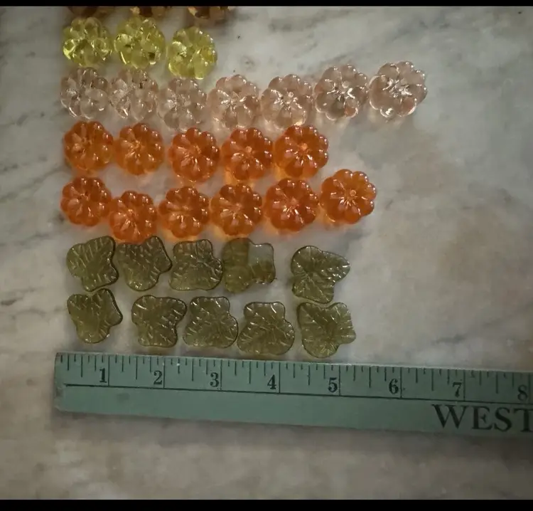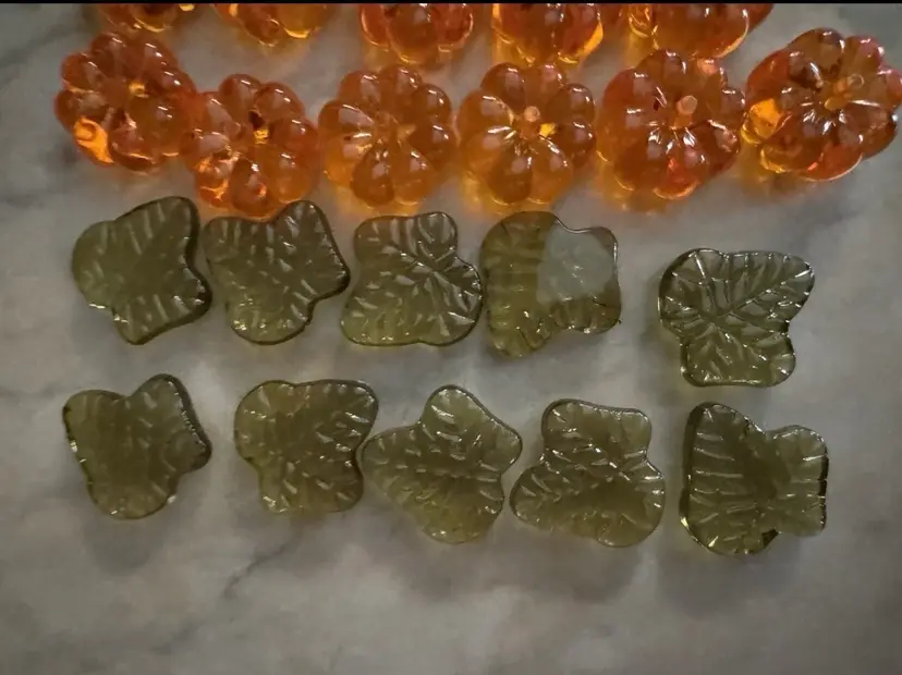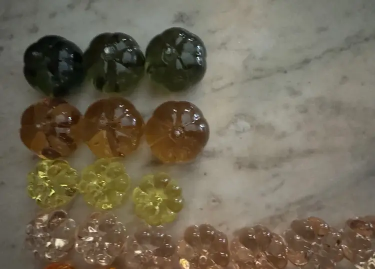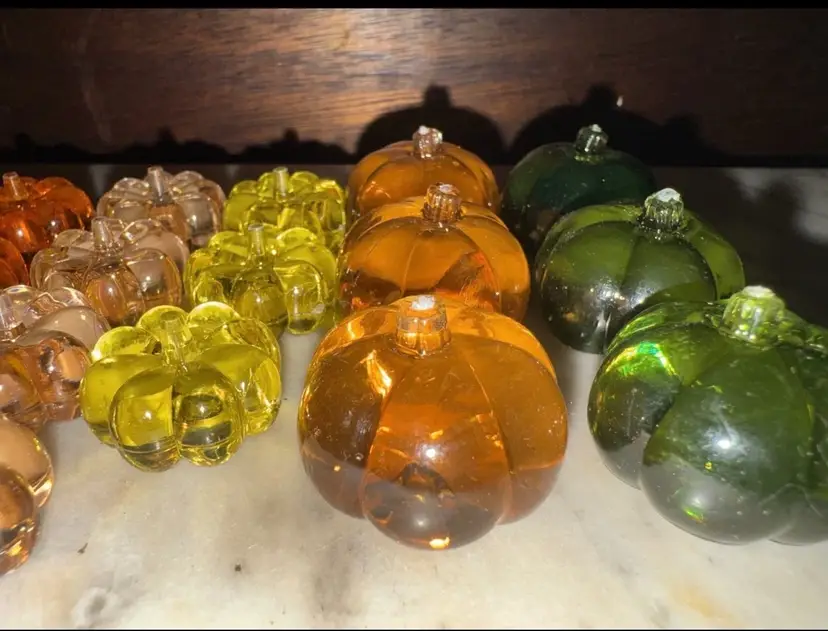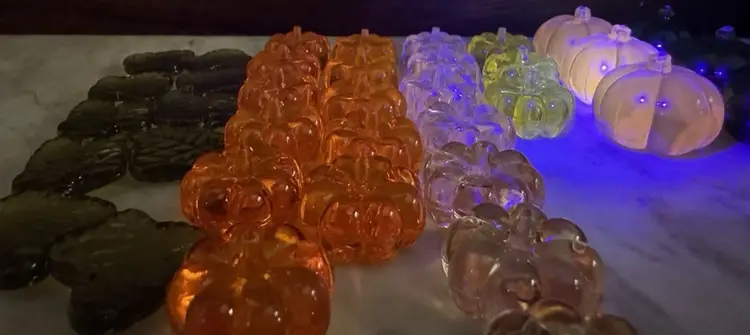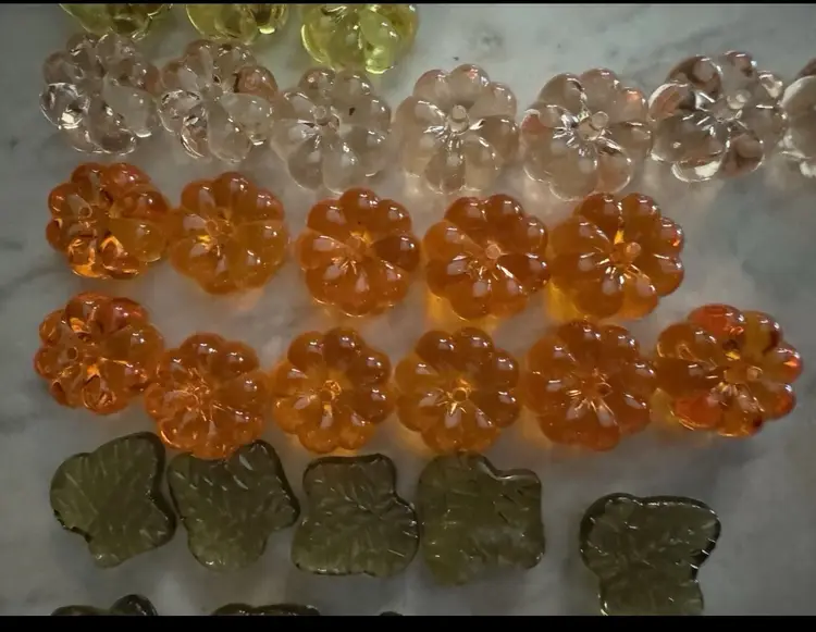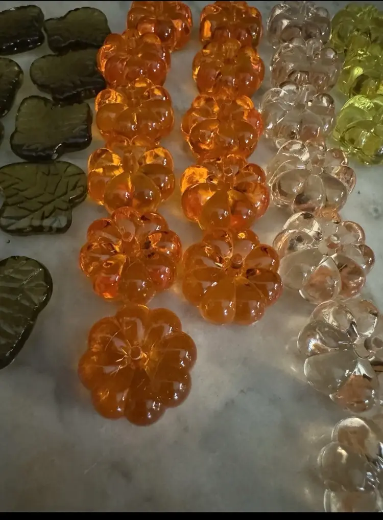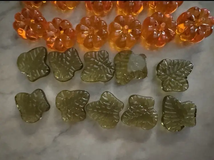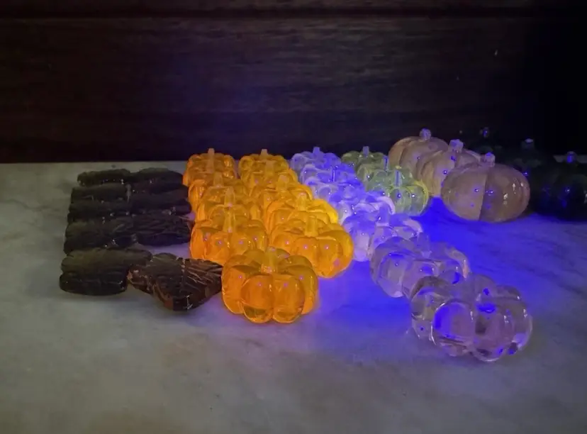 This product is a 6oz bag of miniature pumpkin leaves, perfect for decorating a table scatter or dollhouse during the Thanksgiving Fall season. The leaves are multicolored and UV reactive, adding a festive and whimsical touch to any holiday display. Not handmade, this item is ideal for collectors looking for unique and seasonal décor pieces.