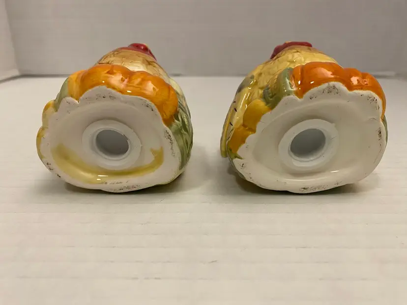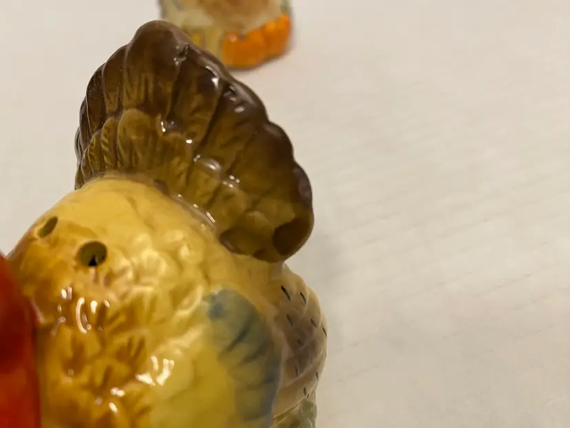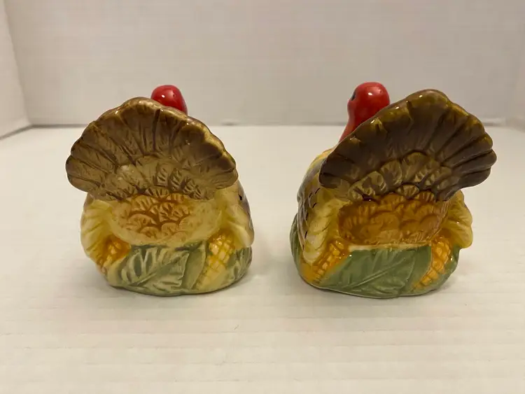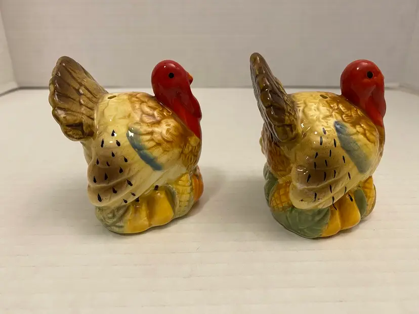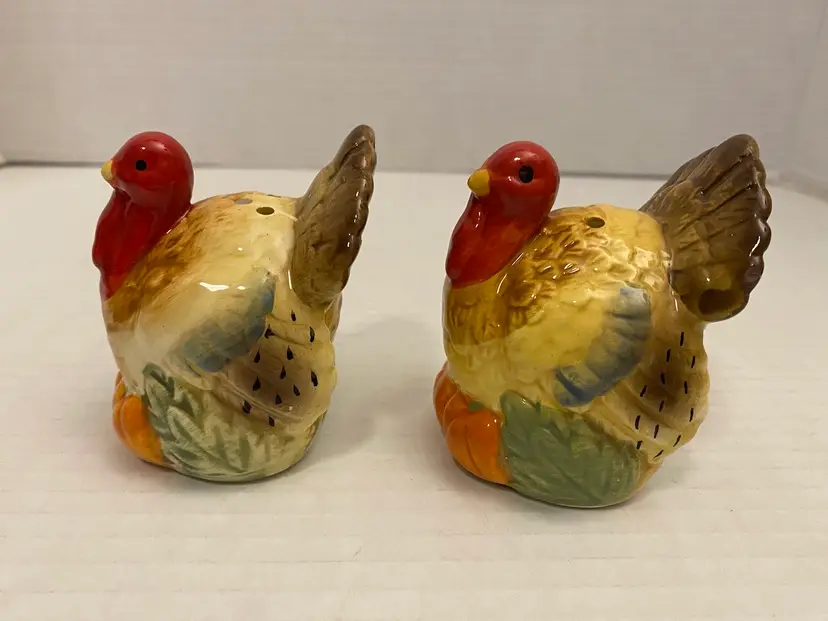 Thanksgiving Turkey Ceramic Salt And Pepper Shakers. Small chip on one of the turkey’s wings, but barely noticeable. See pictures.