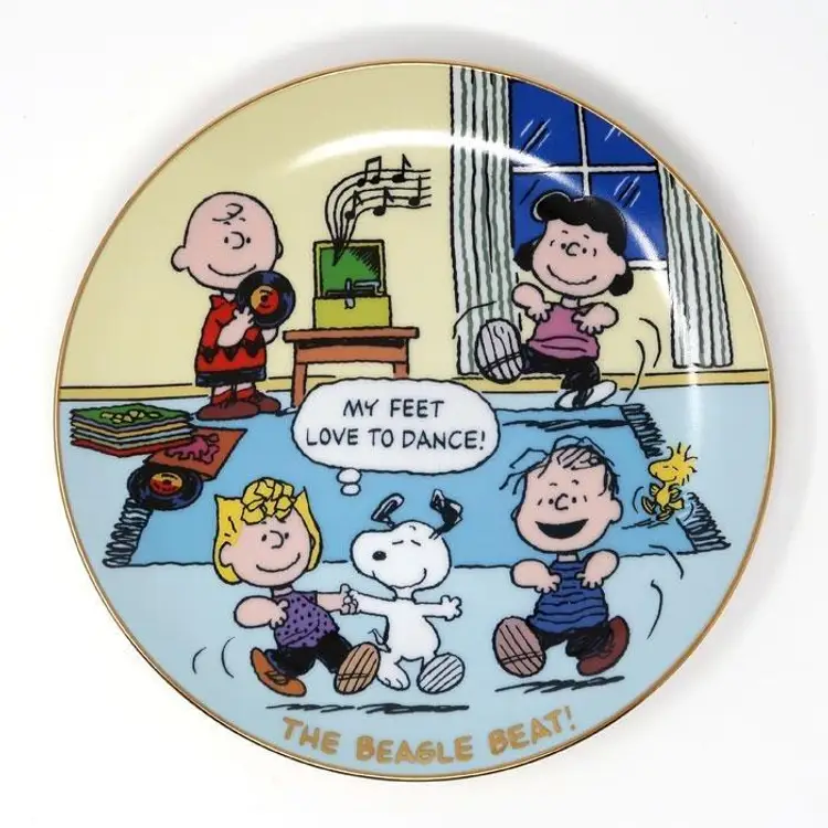 Join Snoopy and the gang with 'The Beagle Beat' Decorative Plate. Featuring Charlie Brown, Lucy, Linus, and Woodstock grooving to the music, this plate is a must-have for any Peanuts fan. Perfect for display, it captures the fun and joy of a Peanuts dance party. In excellent condition. Made by Danbury Mint.