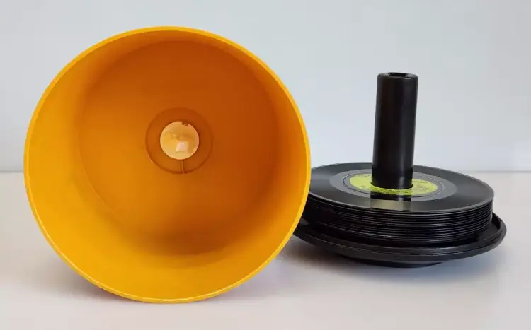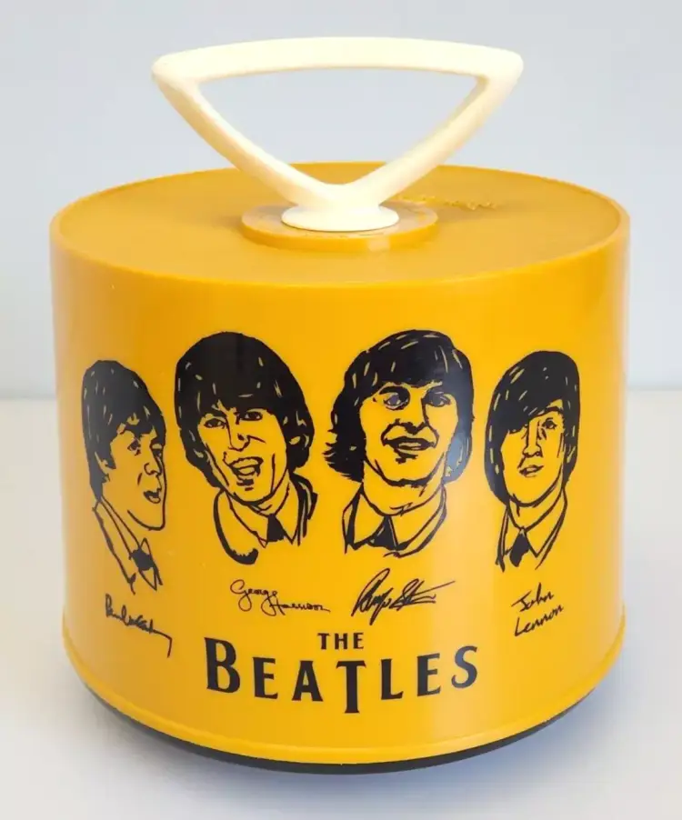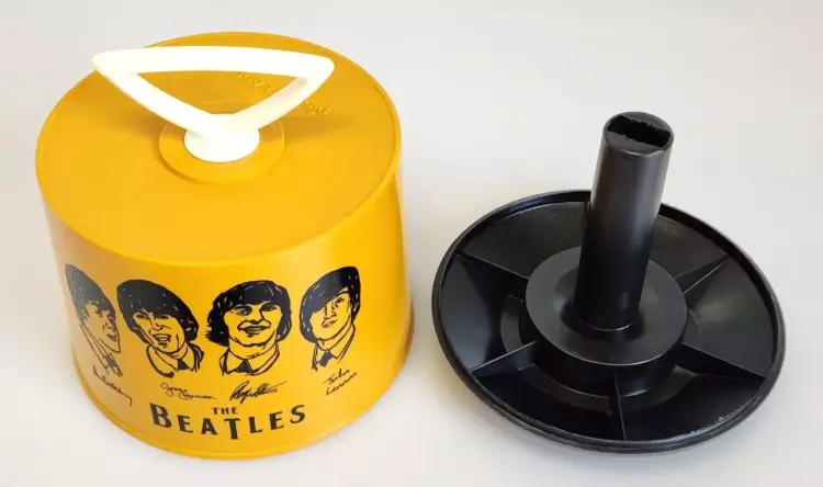 The Beatles Disk-Go-Case 1966 Nems Yellow 45RPM Vinyl Record Carrier, 14 Singles "Disk-Go-Case" 45 RPM 7" Vinyl Record Case The Beatles - Paul McCartney, George Harrison, Ringo Starr & John Lennon Yellow ©1966 NEMS Enterprises, Ltd. (missing sticker) 14x 7" Vinyl Single Records Included: The Plastic Ono Band - Give Peace A Chance / Remember Love - 1809 The Beatles - Hey Jude / Revolution - 2276 The Beatles with Billy Preston - Get Back / Don't Let Me Down - 2490 The Beatles - The Ballad Of John And Yoko / Old Brown Shoe - 2531 The Beatles - Let It Be / You Know My Name - 2764 George Harrison - My Sweet Lord / Isn't It A Pity - 2995 The Beatles - I Want To Hold Your Hand / I Saw Her Standing There - 5112 The Beatles - I Want To Hold Your Hand / I Saw Her Standing There - 5112 The Beatles - Eight Days A Week / I Don't Want To Spoil The Party - 5371 The Beatles - Yellow Submarine / Eleanor Rigby - 5715 John Lennon, Plastic Ono Band - Imagine / It's So Hard - 1840 The Beatles - Please Please Me / From Me To You - VJ 581 The Beatles - Love Me Do / P.S. I Love You - T-9008 The Beatles - She Loves You / I'll Get You - S-4152 Items are used with signs of wear. The Disk-Go-Case is in nice working condition and free of any cracks or other major damage. The "©1966 NEMS Enterprises, Ltd." stickers are missing from the front graphics. Ringo Starr's right eye sticker is starting to peel (see pic). There are light scuffs and dust due to regular use. The vinyl albums are all well worn with small scratches, dust and wear due to previous use. Includes only items pictured. Please view photos for more detail. Thank you