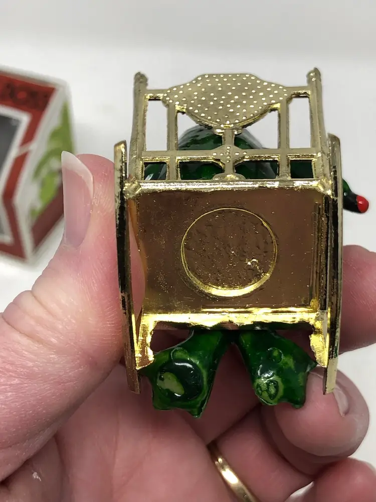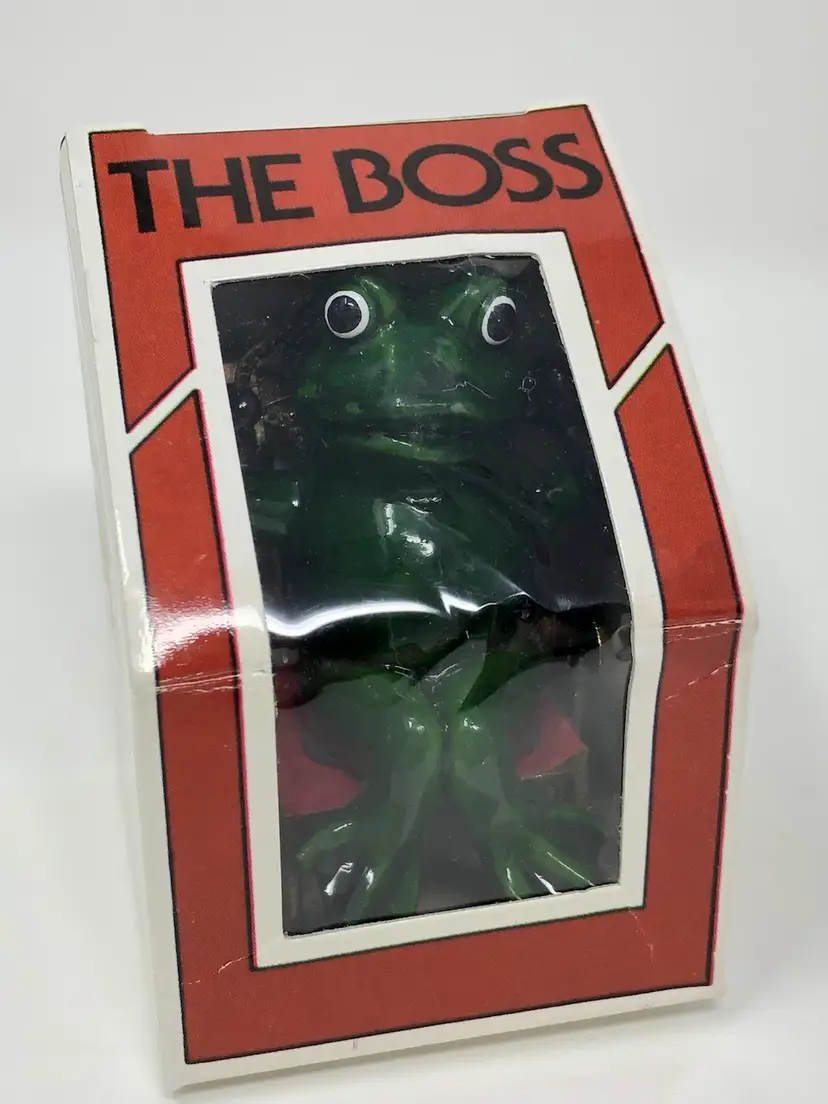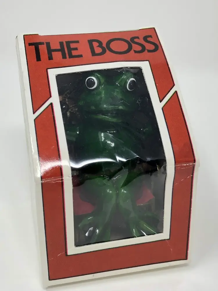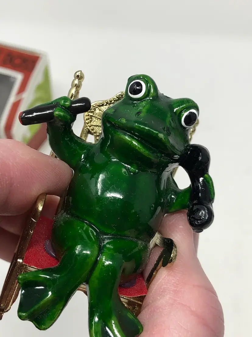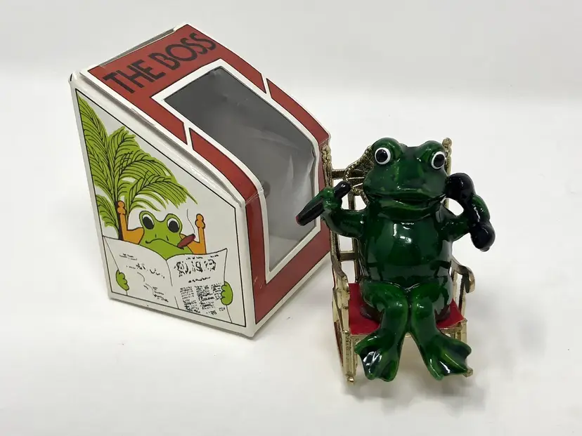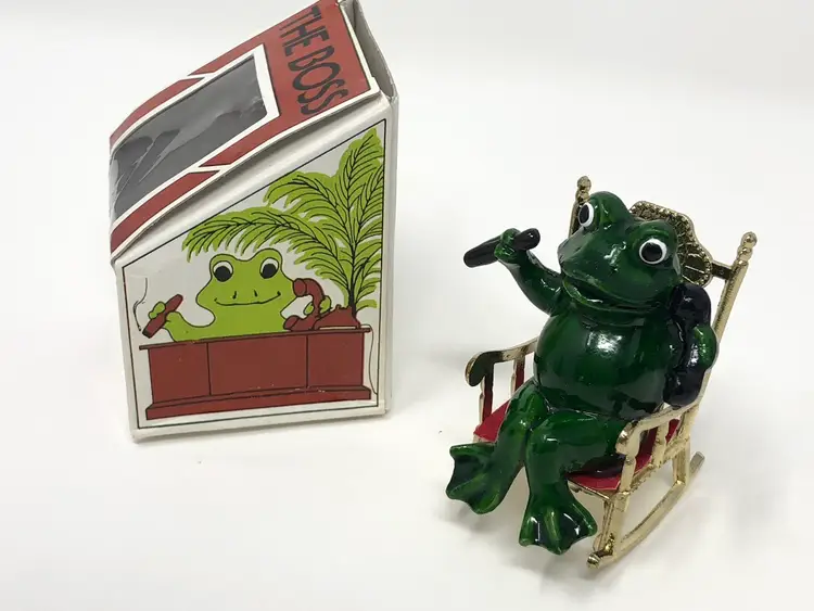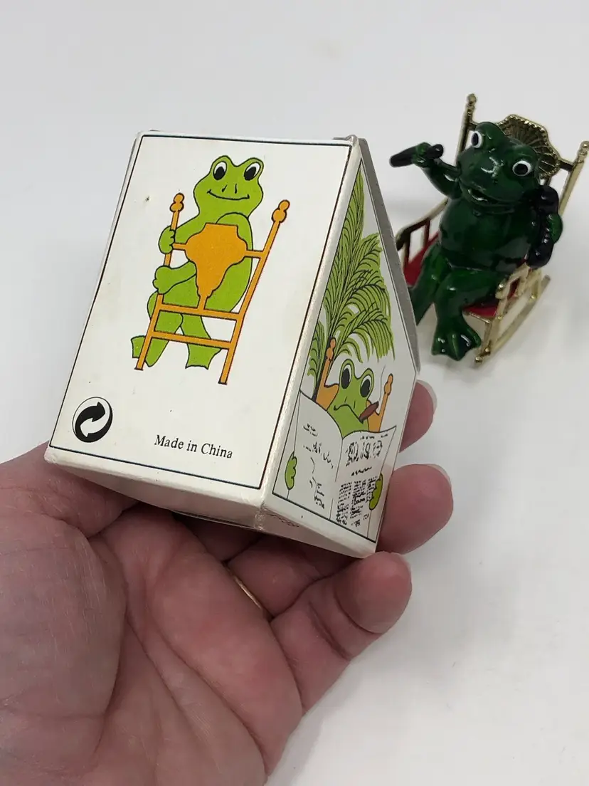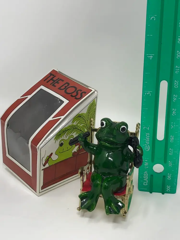 2 1/2" tall figurine is a frog in a rocking chair talking on the phone. The Boss! Original packaging in excellent condition, made in China