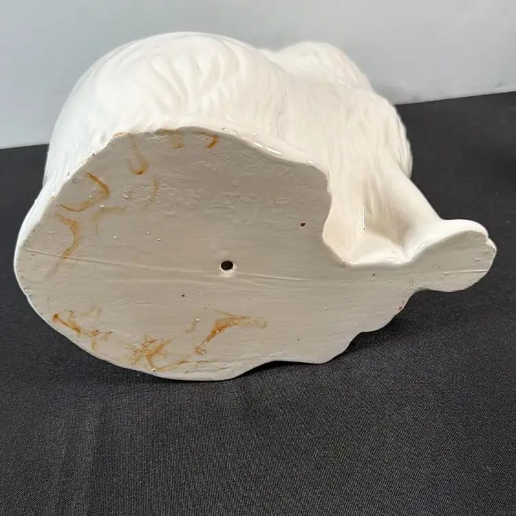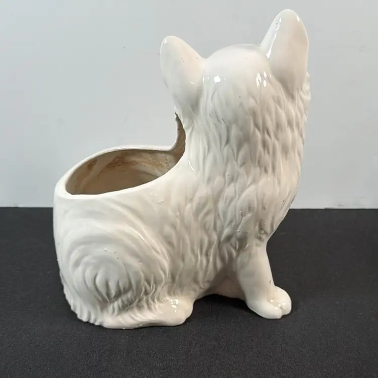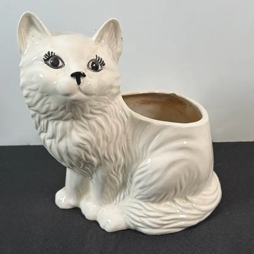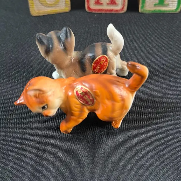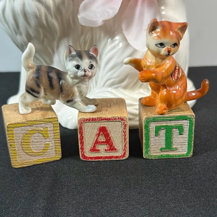 8” x 6” x 3” Hobbyist ceramic cat planter with florals. Has a small chip on the rim. Two bone china cats from Japan. Three vintage wooden blocks
