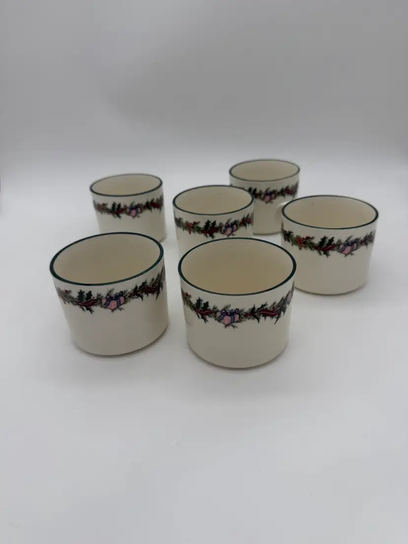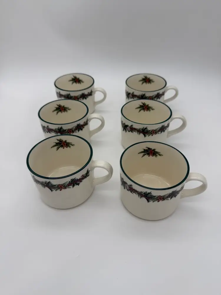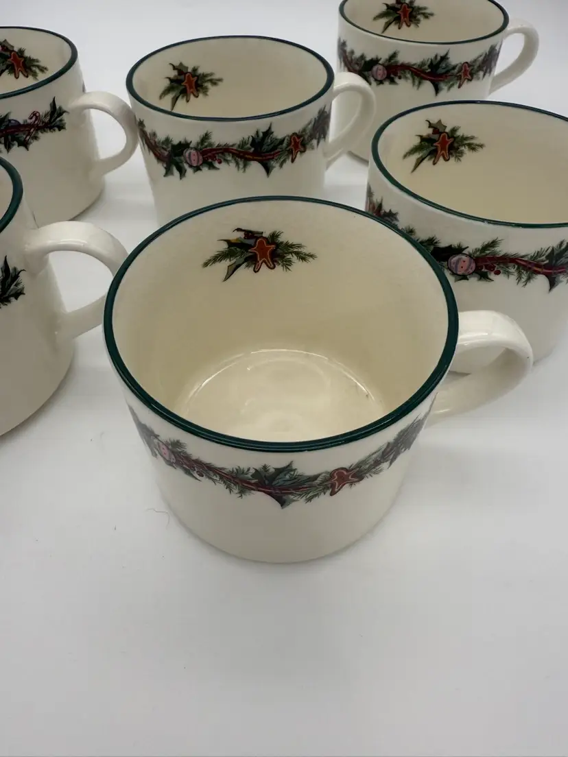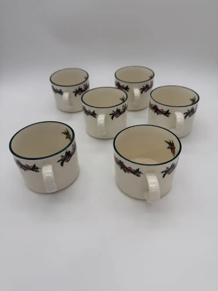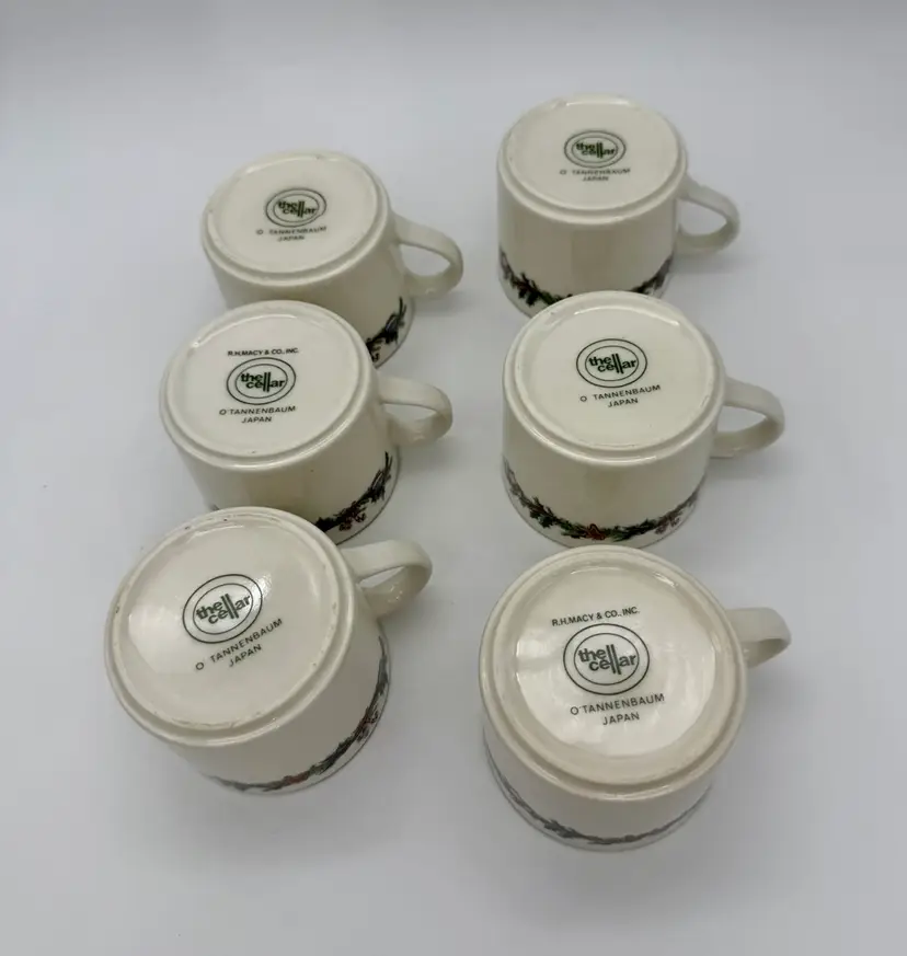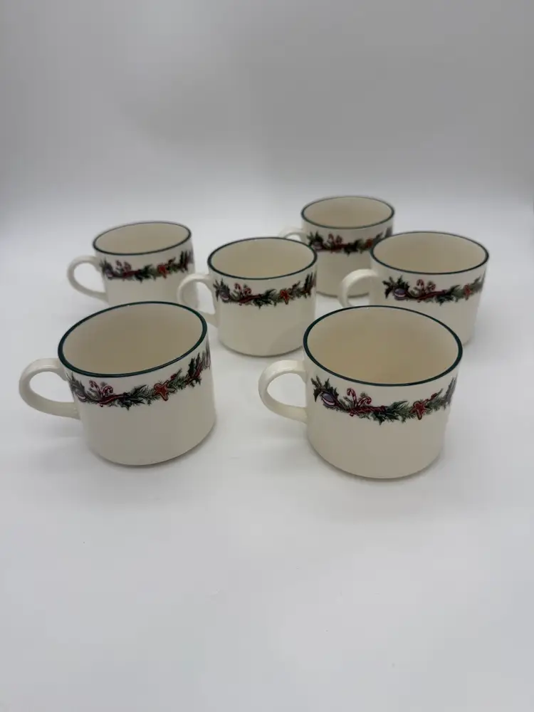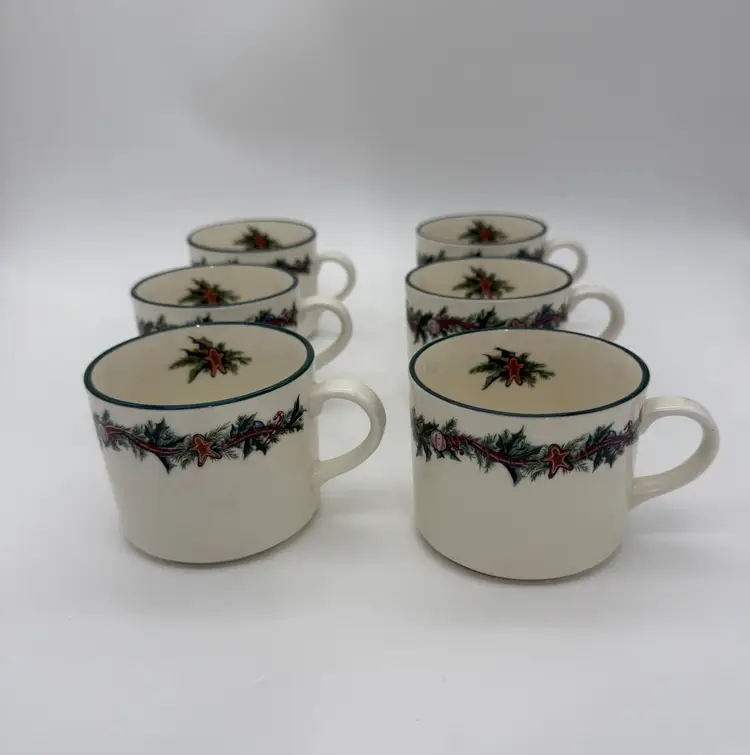 The Cellar O' Tannenbaum Set of 6 Garland Gingerbread Traditional Christmas 8oz Coffee Cups is a vintage six-piece set of round ceramic cups decorated with a festive garland design, perfect for the holiday season. Each cup has a capacity of 8oz and features handles, a solid white base with candy canes and gingerbread cookies accents, and a crackle finish. The set includes six cups, each measuring 3" in height and 3.5" in width, making them ideal for both hot and cold beverages. Perfect for teens, boys, unisex adults, girls, and unisex kids, this set adds a touch of Christmas charm to any kitchen or dining area.