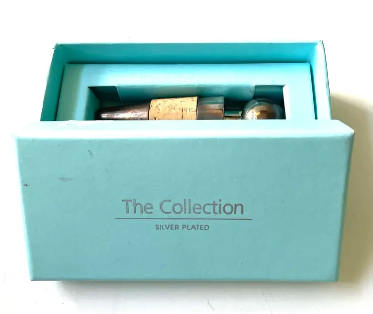 In original box. Box has some missing color from being taped shut. Please view all pictures as they help me describe this silver plated wine stopper. As always thank you for visiting my store.
