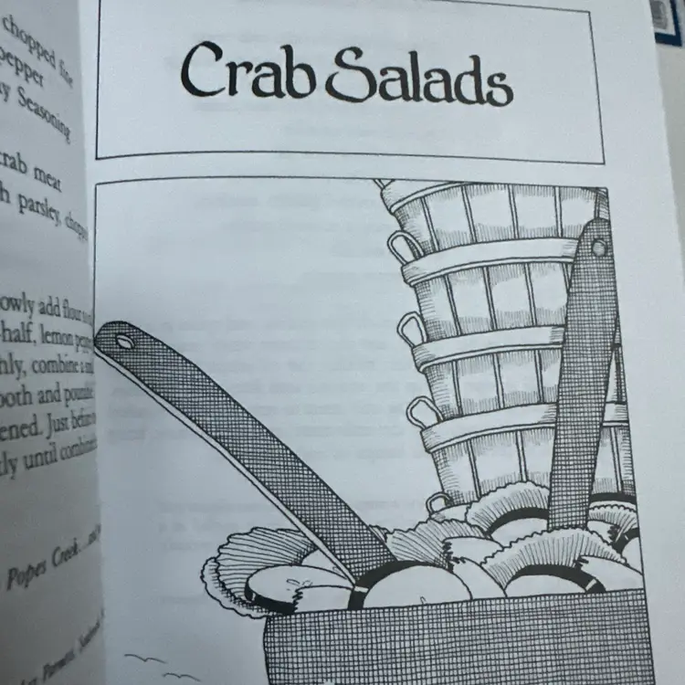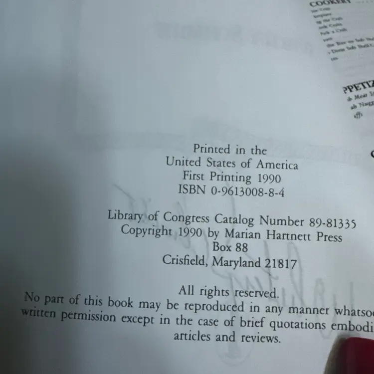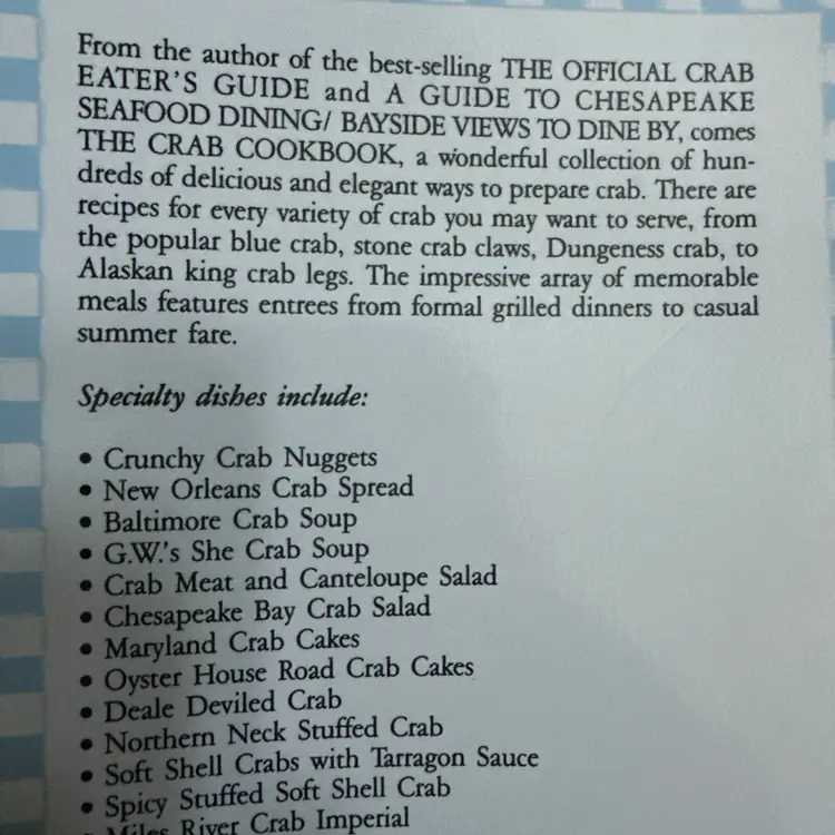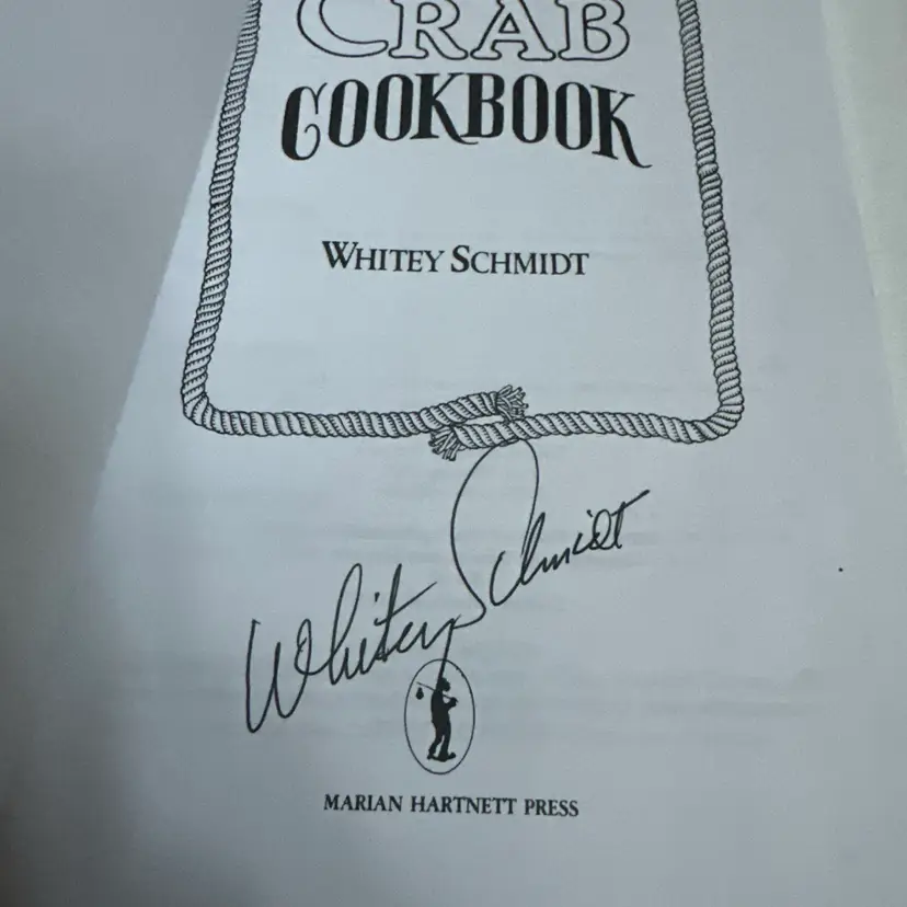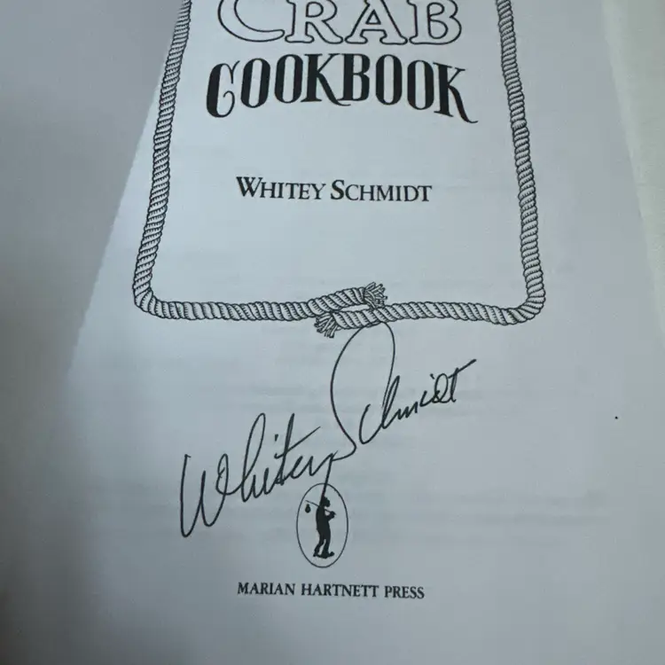 The product is a signed paperback book titled "Crab Cookbook" by author Whitey Schmidt, published by APG Sales & Distribution Services in 1990. It is a 224-page cookbook focusing on crab recipes, categorized under Cooking genre with topics on Regional & Ethnic American cuisine, specifically Middle Atlantic States, and Specific Ingredients like seafood. The book is written in English and measures 9 inches in length, 6 inches in width, and 0.5 inches in height.