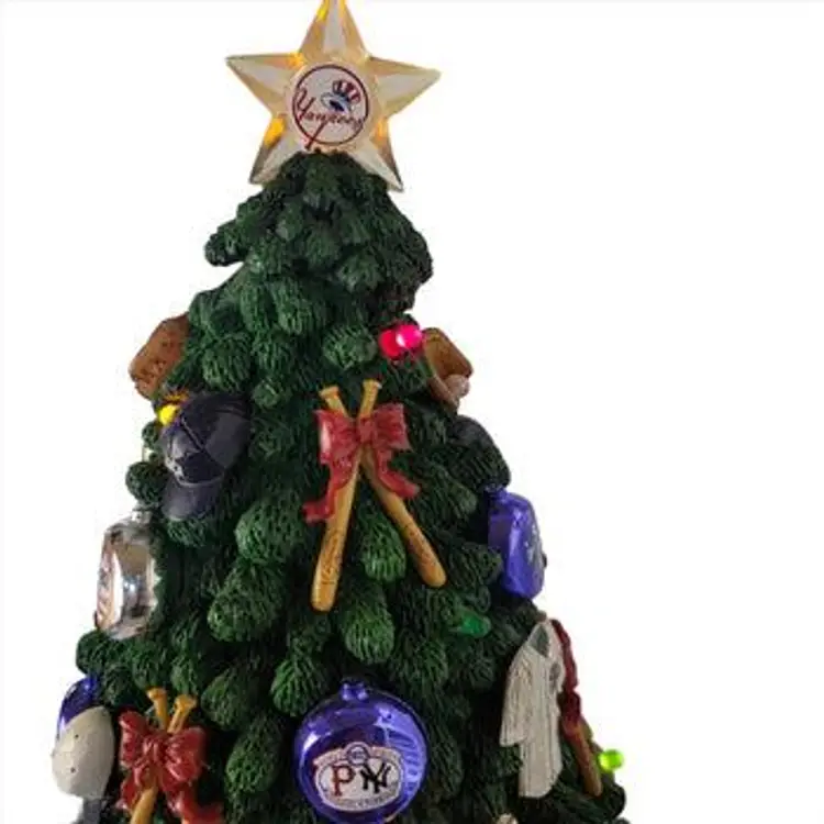 New York Yankees Lighted Christmas Tree Danbury Mint Complete Box.15.5 Inches tall and comes with base and plug-in original box and packaging. pre-own in good condition few of the lights are not on when you move them some come on maybe about 5 not working not noticeable base felt is coming off and can be resecured.