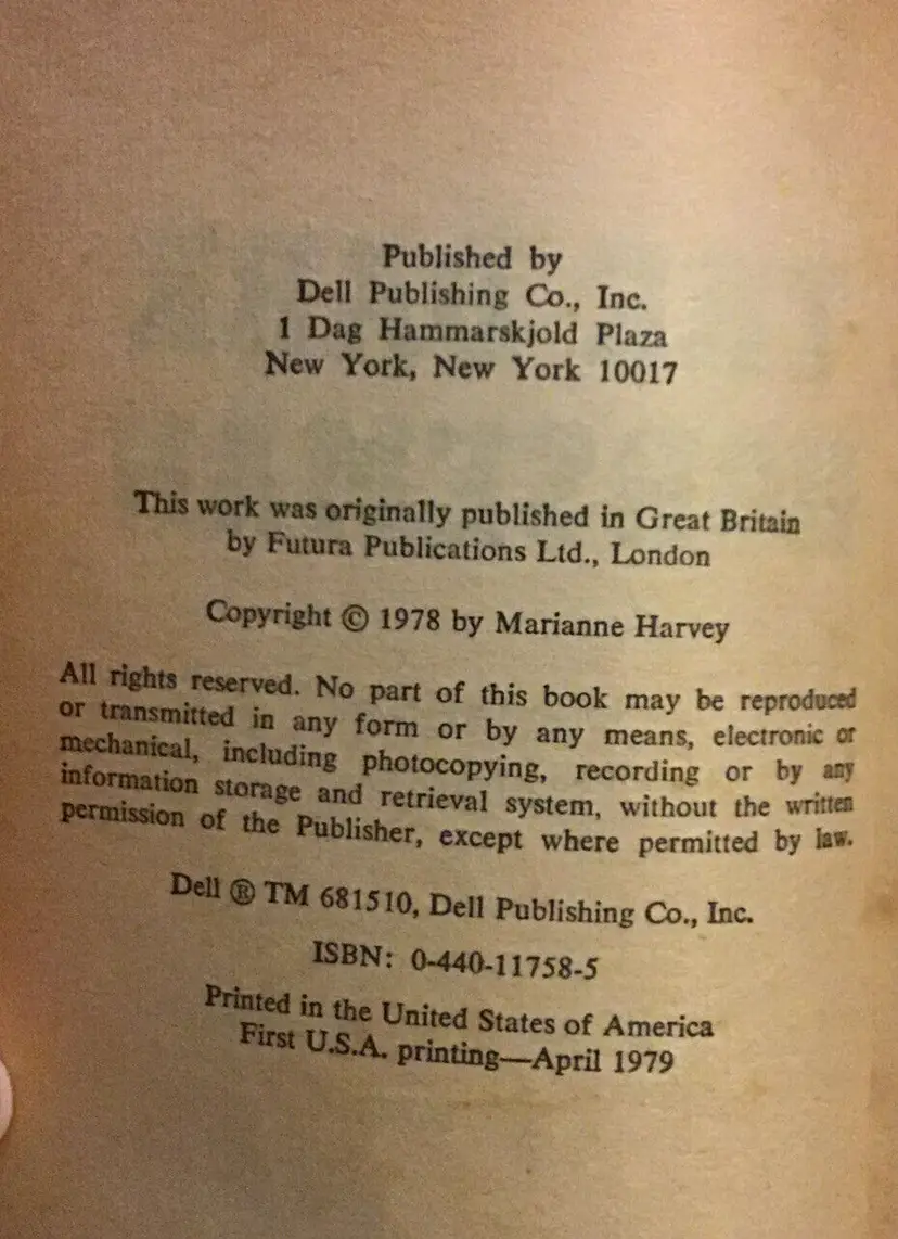 First US Printing 1979 Paperback Dell Romance Creases In Cover Yellowed With Age Feel Free To Contact Me With Any Questions Year Printed: 1979 Country/Region of Manufacture: United States Topic: Romance Binding: Softcover, Wraps Author: Marianne Harvey Subject: Literature & Fiction Language: English Publisher: Dell Place of Publication: New York
