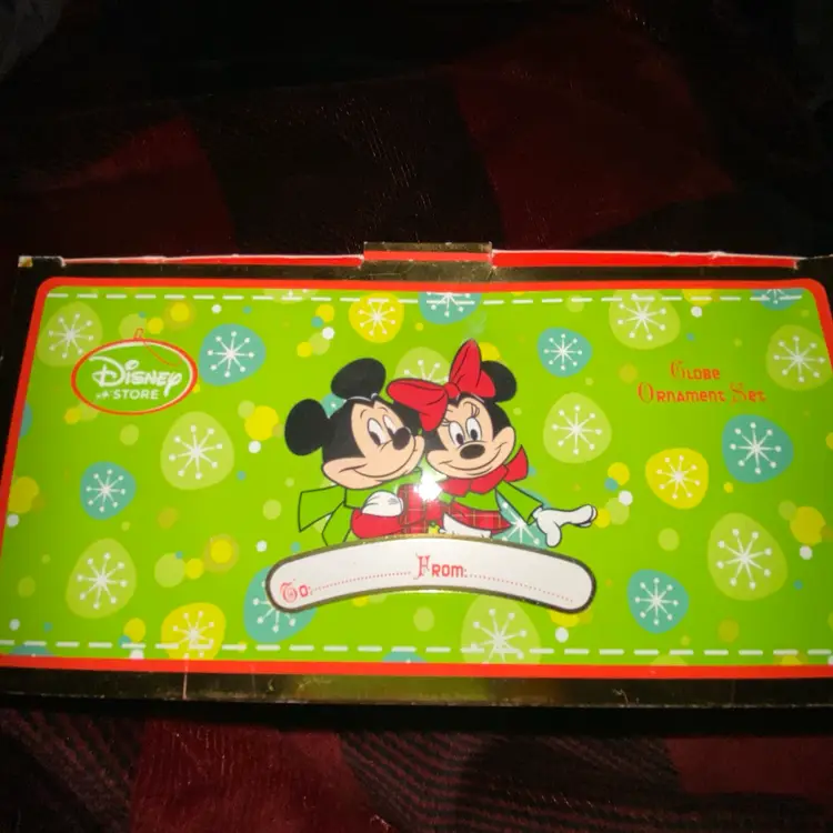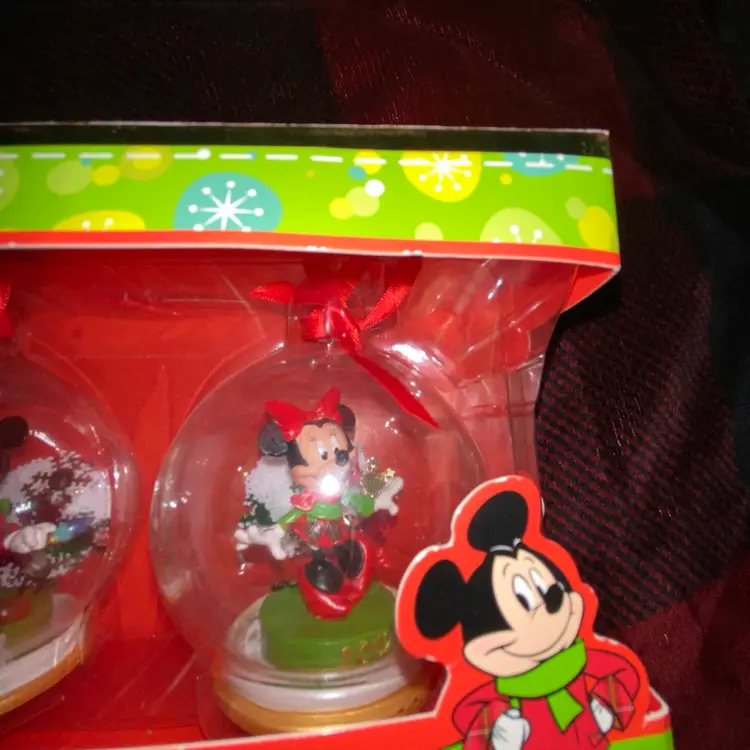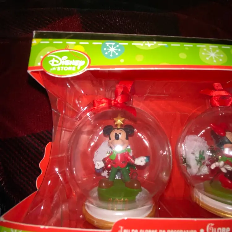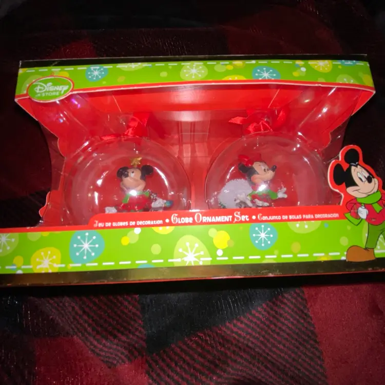 The Disney Store 2012 Mickey And Minnie Mouse globe Ornament Set.