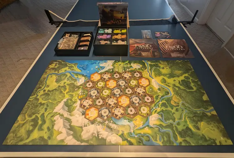 Box size is 23inx16"x10" (it is big due to the playmat) and weighs 14lb.