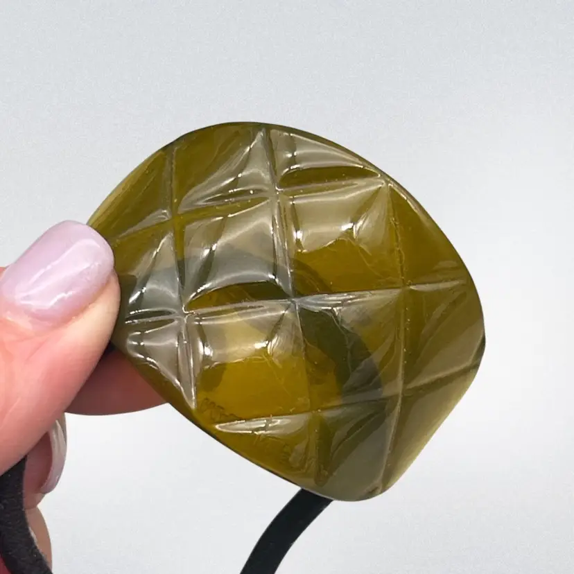 The sculpted, faceted design creates a subtle geometric texture, giving it a modern yet timeless look. Finished with a glossy surface and paired with a durable black elastic, it offers both style and a secure, comfortable hold for ponytails, buns, or wrist wear.