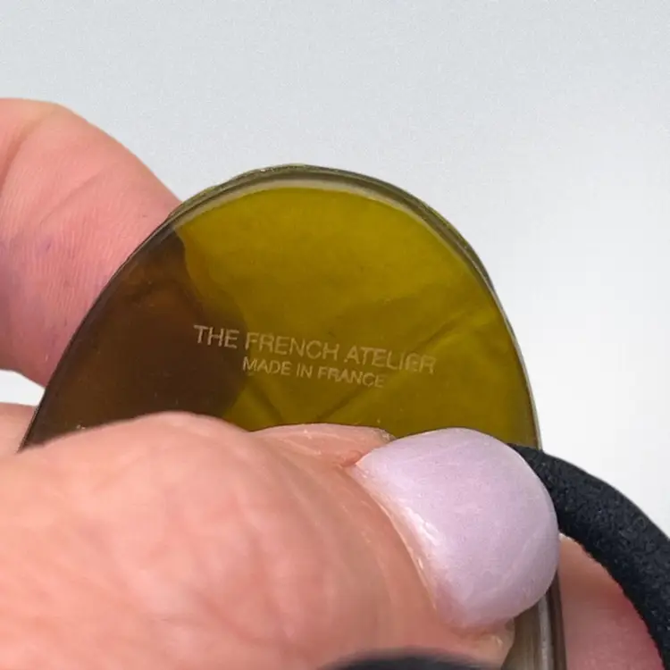 Add a refined, earthy touch to your everyday style with this high-end acrylic hair tie by The French Atelier, made in France. Featuring a rich olive green tone with a softly translucent quality, this piece has depth and dimension that catches the light beautifully.