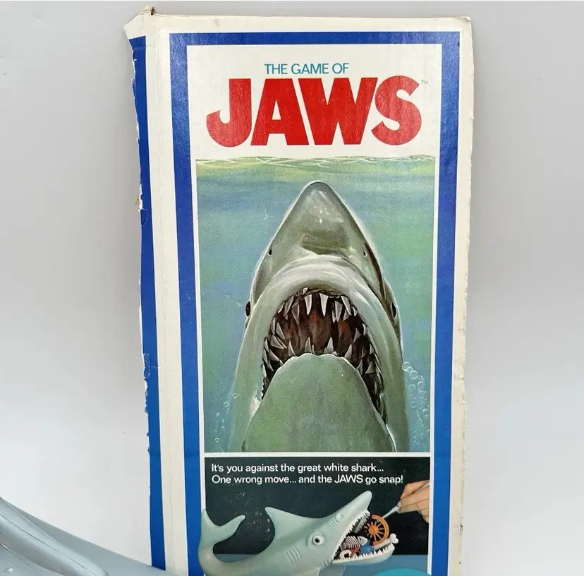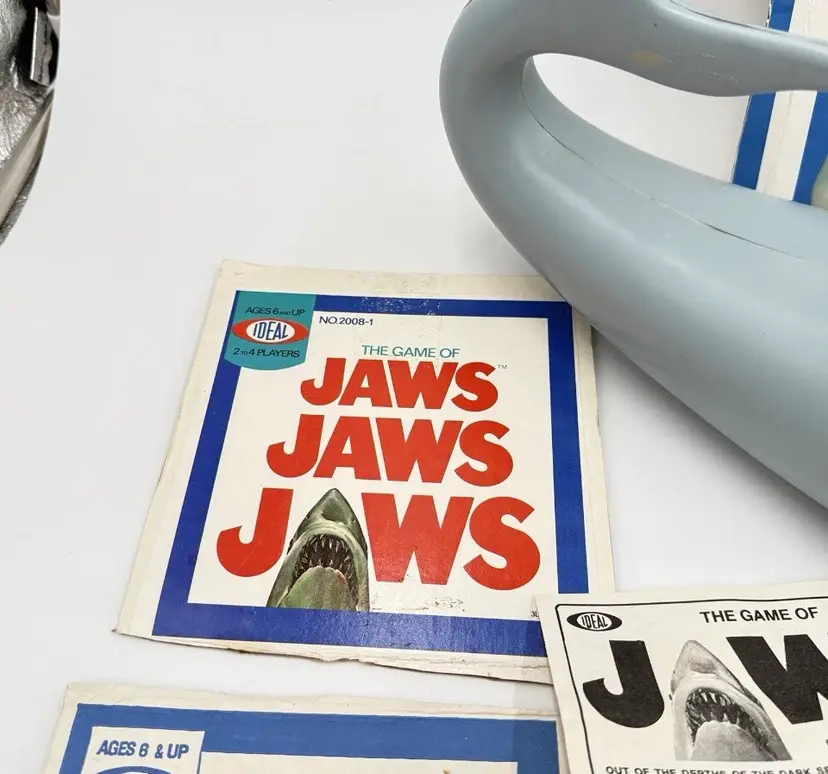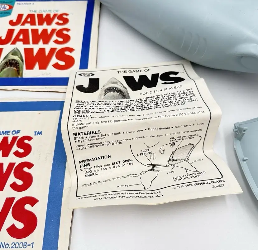 The Game of Jaws from Ideal (1975) This is a rare opportunity to have a very minty open display piece! being sold as used because it is all out of box. But this one was never played with or never even assembled. All the original parts are included and in minty condition. The only thing missing is the sticker for the right eye. parts of the cut up box will also be included please see pictures for the best explanation of the item and condition