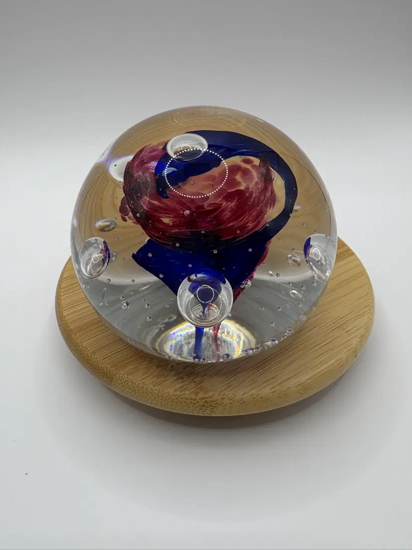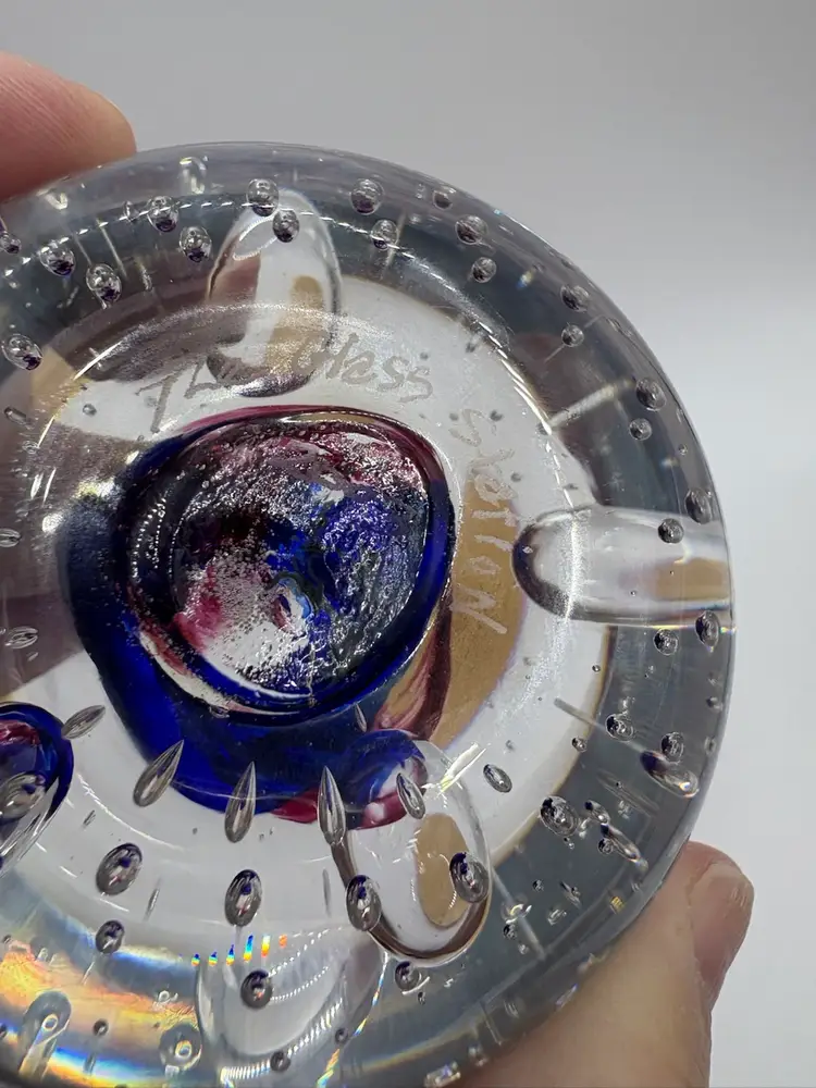 Blue and red swirl glass paperweight With controlled bubbles of various sizes Signed The Glass Station Measures 2 1/2 inches tall by 3 inches wide No chips or cracks. In excellent condition