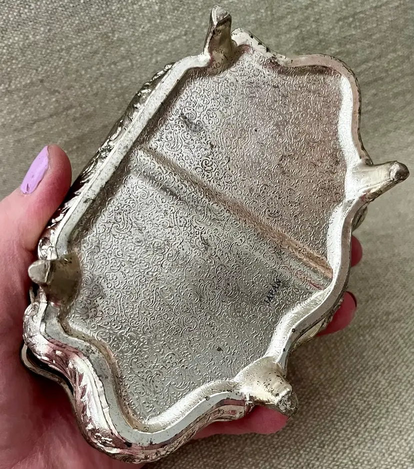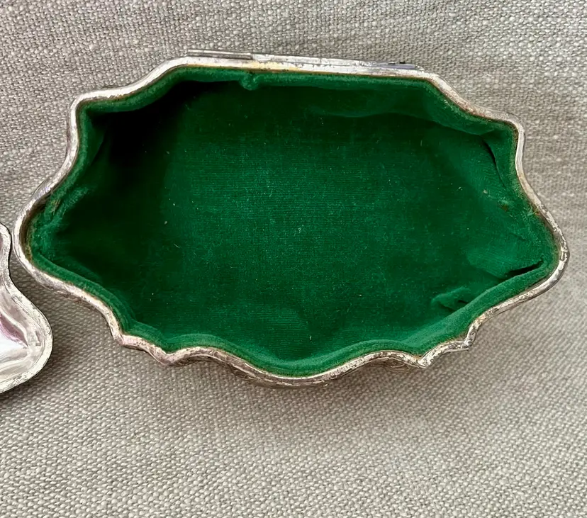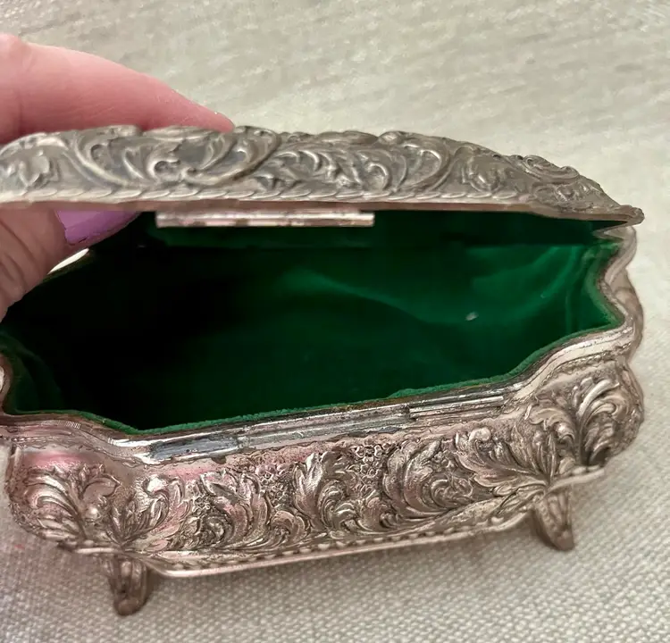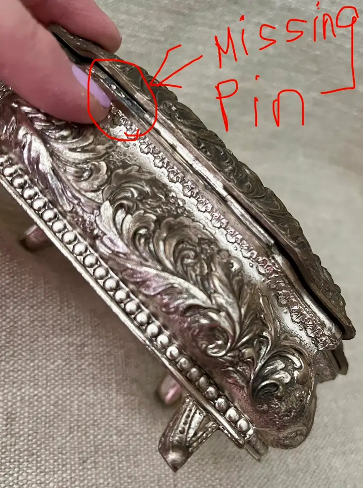 Please look at all the photos prior to deciding to make a purchase. This is a gently used / pre-owned item. And, VINTAGE (20 years +) is seldom perfect. This is no different. Patina, a broken hinge-pin, and the padding under the green velvet is bunched as it deteriorated under the velvet. Buyer is strongly encouraged to review the photos and decide for themselves its condition as my interpretation may not align with yours. Prior to a purchase, questions not answered in photos, details, description are welcome.