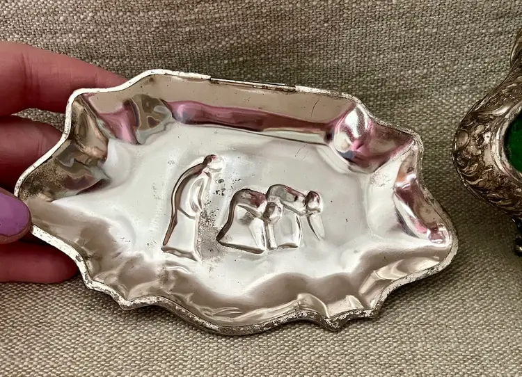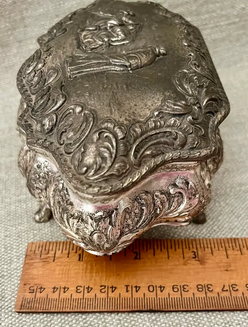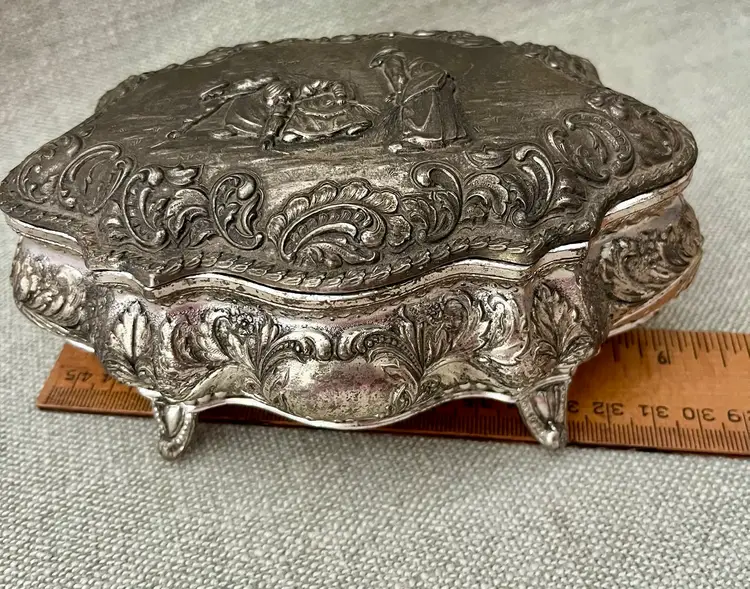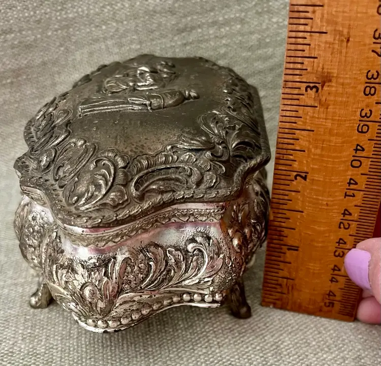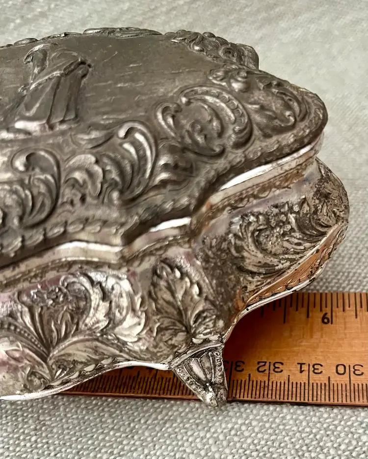 Taking a nod to “The Gleaners” by Jean-Franco Millet, with Rocco Style Border this Green Velvet Lined Silver Tone Casket Jewelry is a vintage-inspired jewelry box suitable for storing necklaces, bracelets, anklets, rings, cufflinks, earrings, and body jewelry. Made of metal with a velvet lining, this oval-shaped casket features dimensional stamped images and measures approximately 6" in length. Suitable for women and originating from Japan.