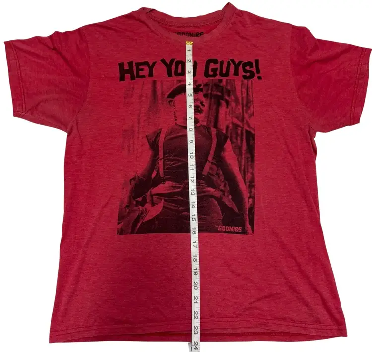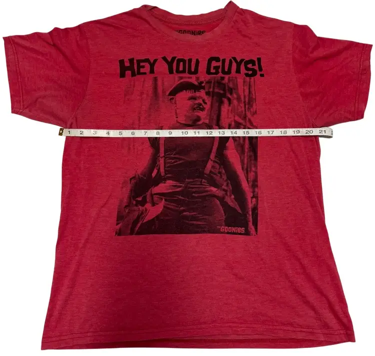 The Goonies Sloth “Hey You Guys” Vintage Red T-Shirt by Ripple Junction in size Large is a classic addition to any fan's wardrobe. Made from comfortable cotton material, this vintage shirt features The Goonies sloth character in a solid red color with a crew neckline and short sleeves. Perfect for fans of the 80s classic movie, this regular fit shirt is ideal for all seasons and offers a nostalgic touch with its retro design. Perfect for men who love The Goonies and vintage movie-themed clothing.