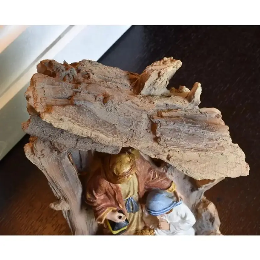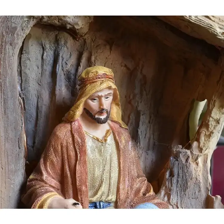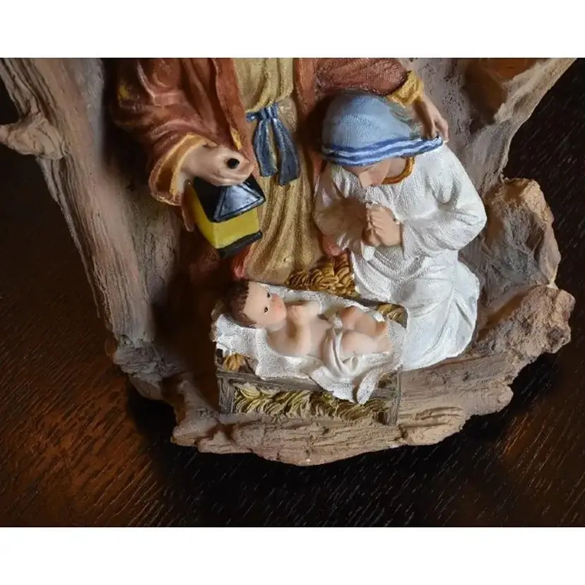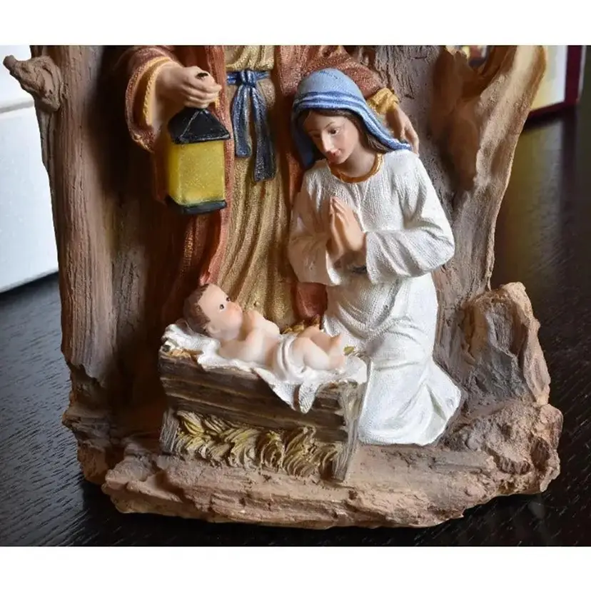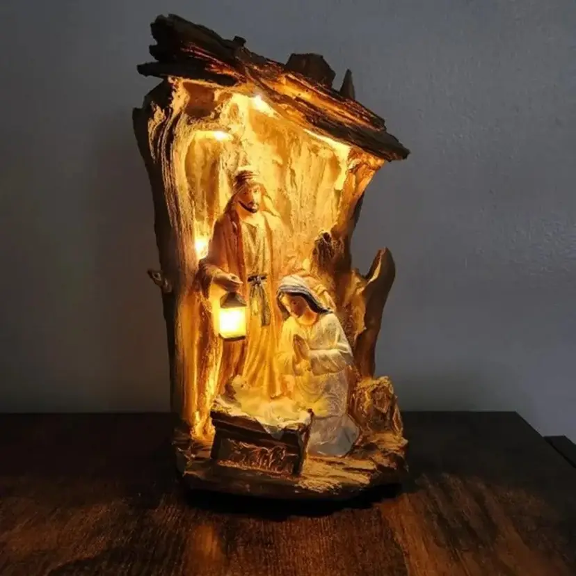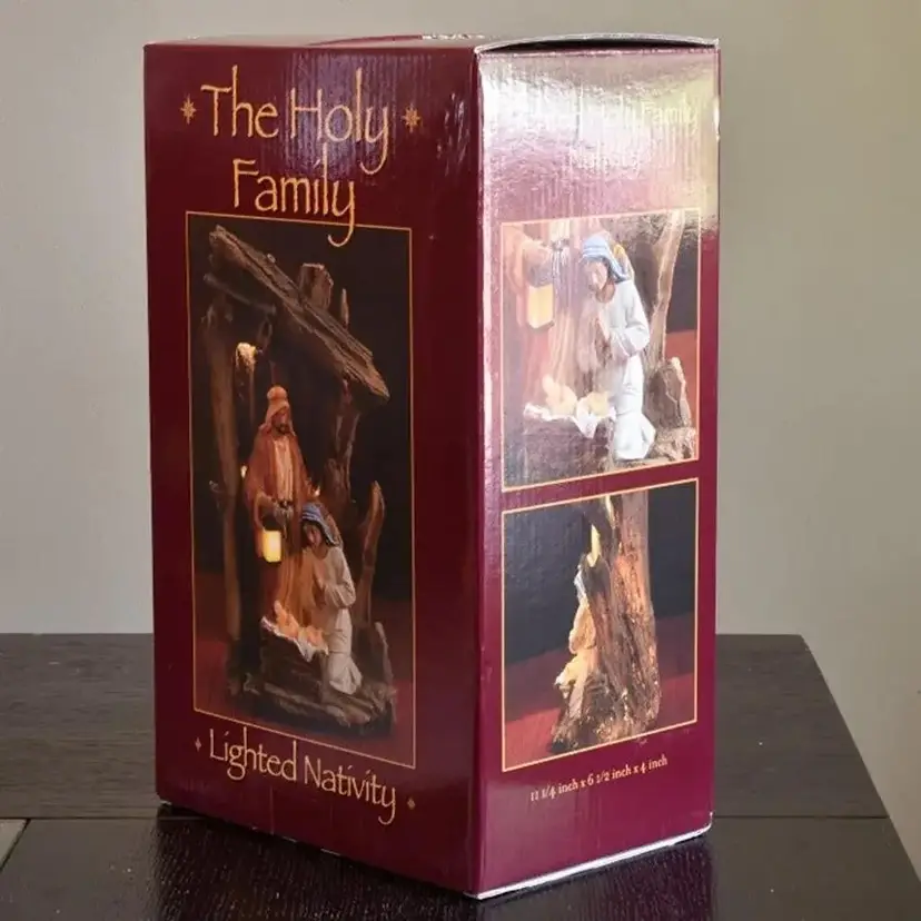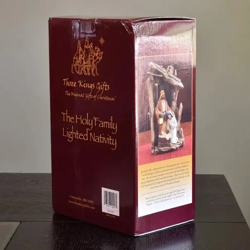 The nativity is about 11.25" high x about 6.5" wide x about 4" deep. It does come with the box and Styrofoam protection provided in box. This nativity does require 2 AAA batteries (NOT INCLUDED). Please see the 2nd photo showing how it looks lit up when batteries are inserted.