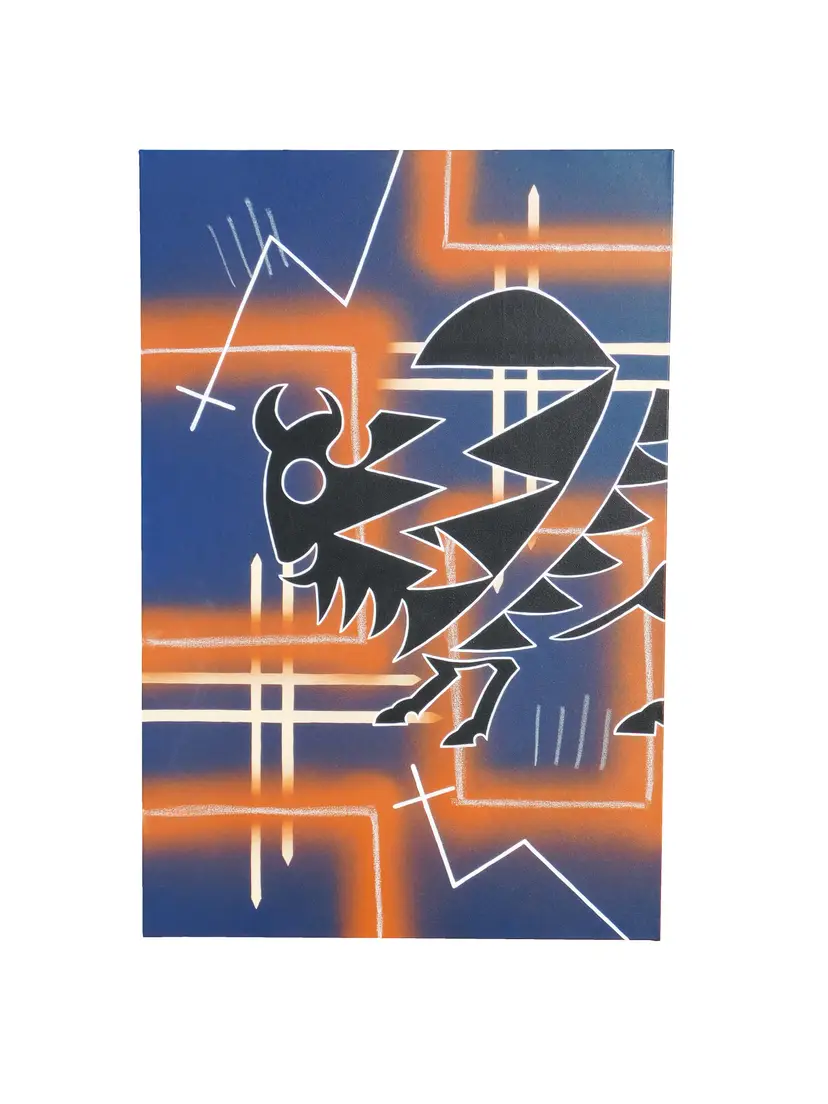 The Hopi Buffalo represents Strength & The Coming of The Winter Spirits. Within The Buffalo design is a Lightening design and Trickling Waters. Included in this painting are Stars, as well as portals in which medicine men and women can foresee what is coming in ones life, and/or to bring healing and to dispose of illnesses. The four marks represent the four seasons, the four continents, the four ethnicities, and the four directions. The white lines that look like crosses; that is Lightening painted in the Hopi old style way. This painting is done on a 24 in. x 36 in. canvas and was hand-painted with acrylic, and oil pastels was used.