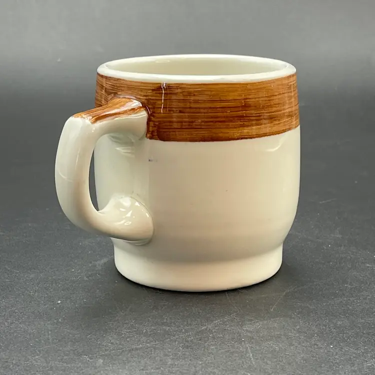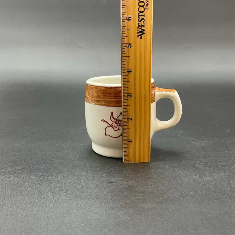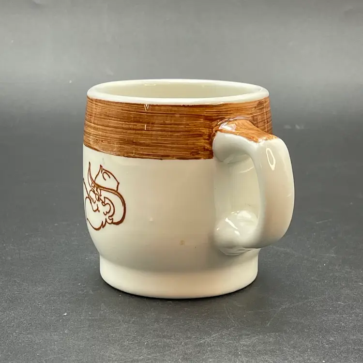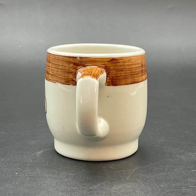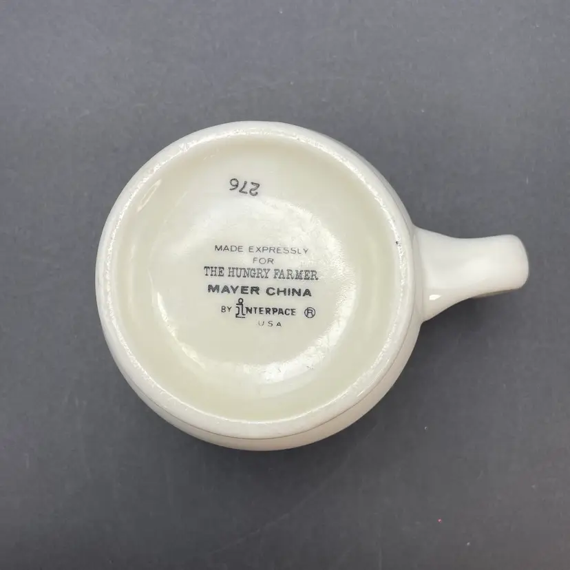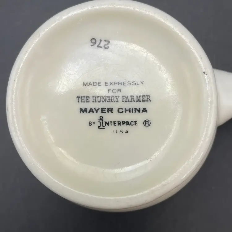This is a vintage Mayer China The Hungry Farmer restaurant ware coffee mug. Marked on the bottom. Measures approximately 3.25" tall x 3" across the top and holds approximately 10fl oz. There is a crack in the glaze at the bottom of the handle as shown in pictures. No