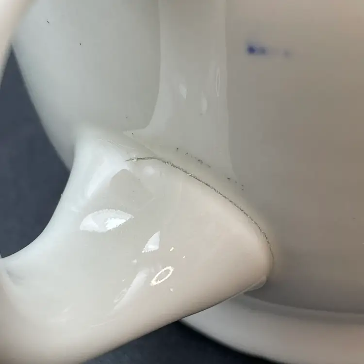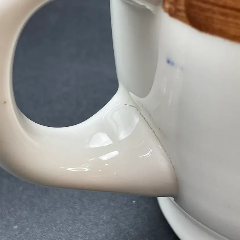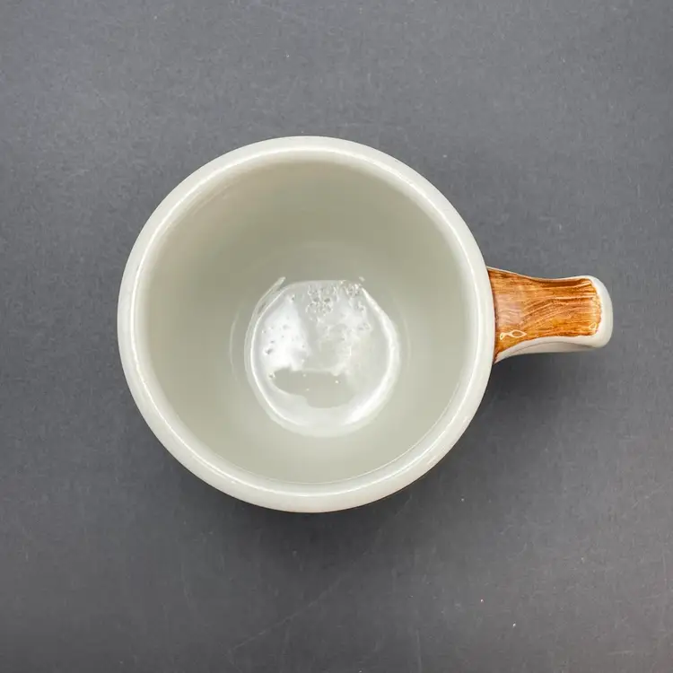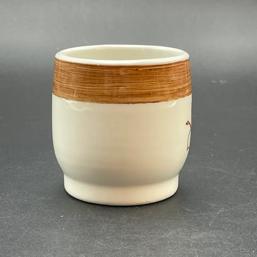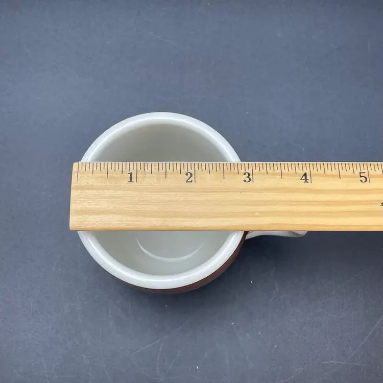 This is a vintage Mayer China The Hungry Farmer restaurant ware coffee mug. Marked on the bottom. Measures approximately 3.25" tall x 3" across the top and holds approximately 10fl oz. There is a crack in the glaze at the bottom of the handle as shown in pictures. No