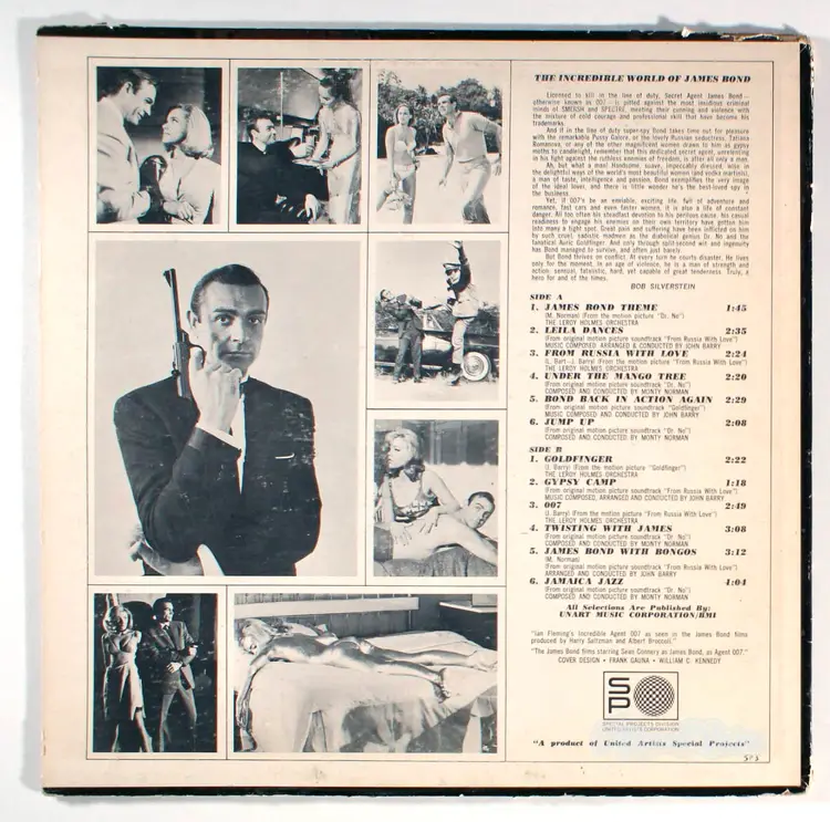 The Incredible World of James Bond was a 1965 television special produced by David L. Wolper for United Artists Television to showcase the James Bond film series and promote the upcoming December 1965 release of the film Thunderball. Pepsi Cola and Frito Lay also sold promotional James Bond tie-in toys and a record album titled The Incredible World of James Bond. The album featured the original soundtrack music and cover versions of four of the themes from the first three Bond films played by United Artists Records house band The Leroy Holmes Orchestra. The back of the album cover was full of photographic stills from the Bond films. The record was later reissued with an attractive Frank Gauna designed album cover on Unart Records in 1967 with two music tracks deleted to fit on the budget album.