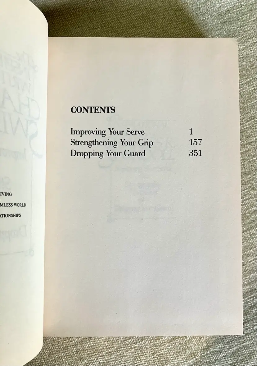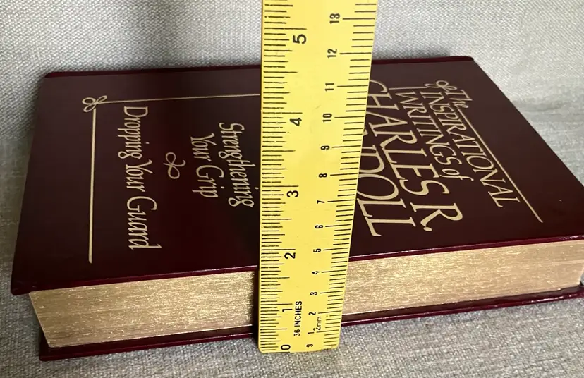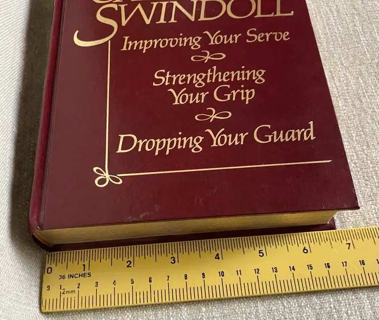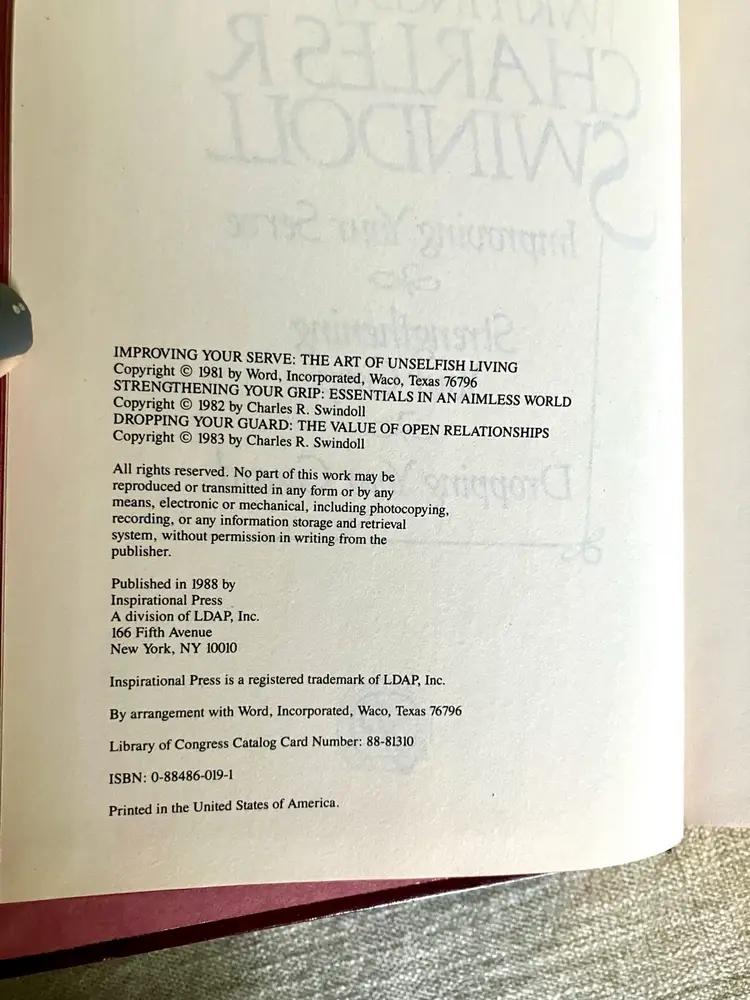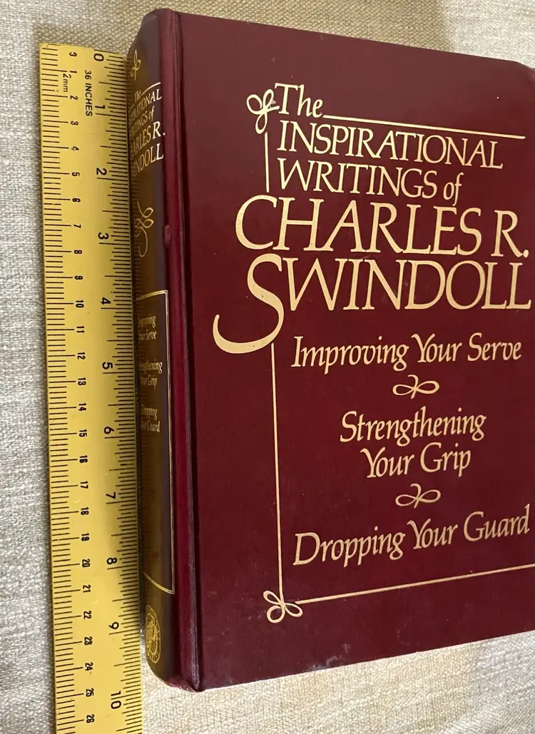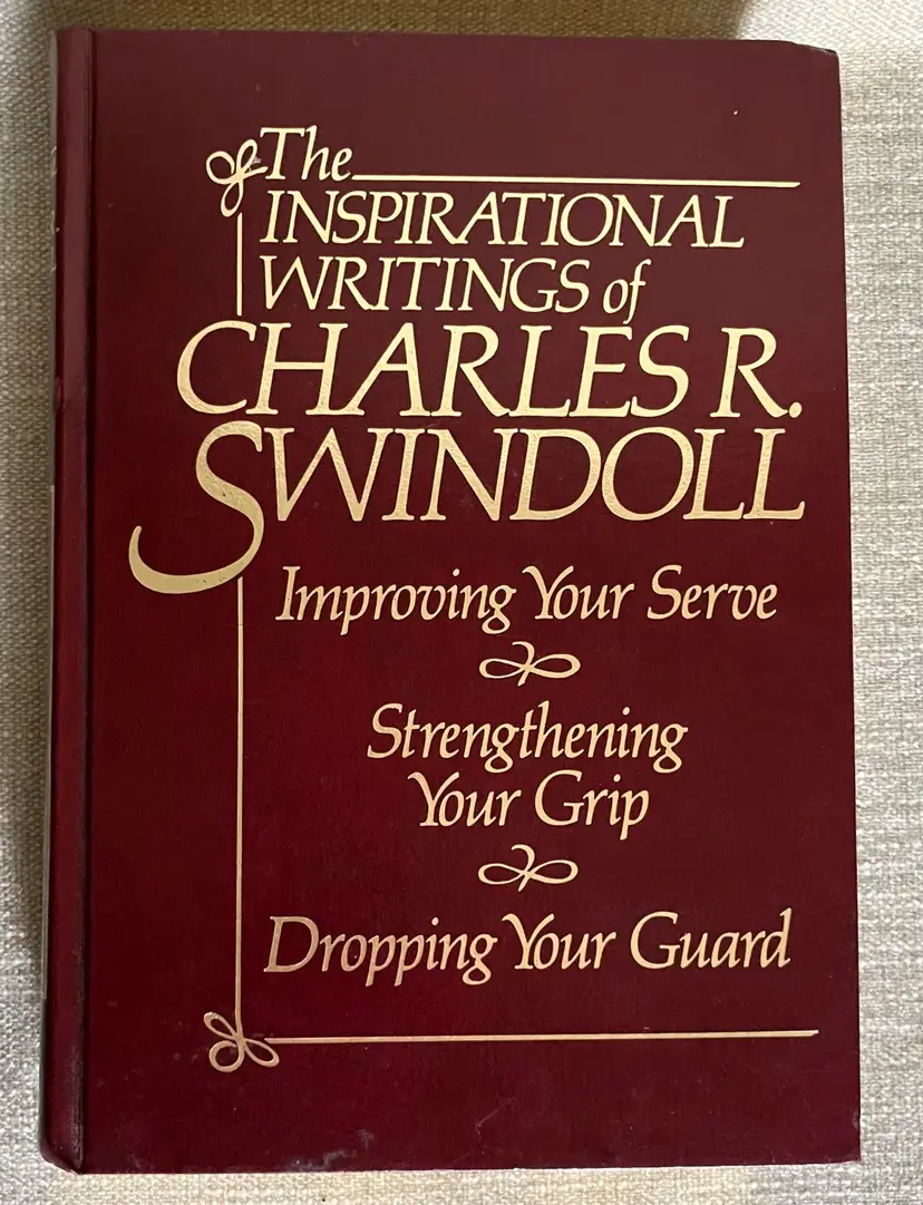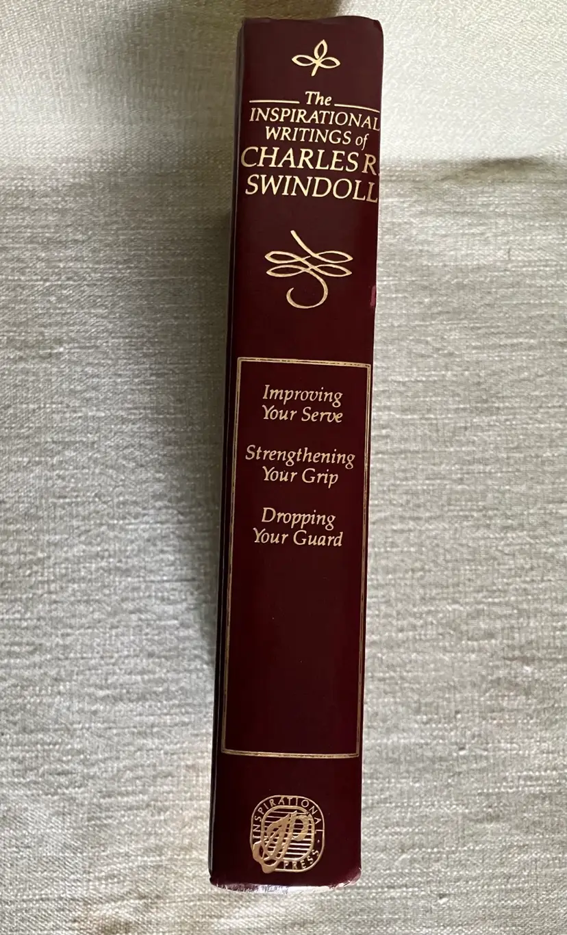 The Inspirational Writings of Charles Swindoll Leather Bound Gold Edged 1988 Red covering: “Improving Your Serve”, “Strengthening Your Grip”, and “Dropping Your Guard”.