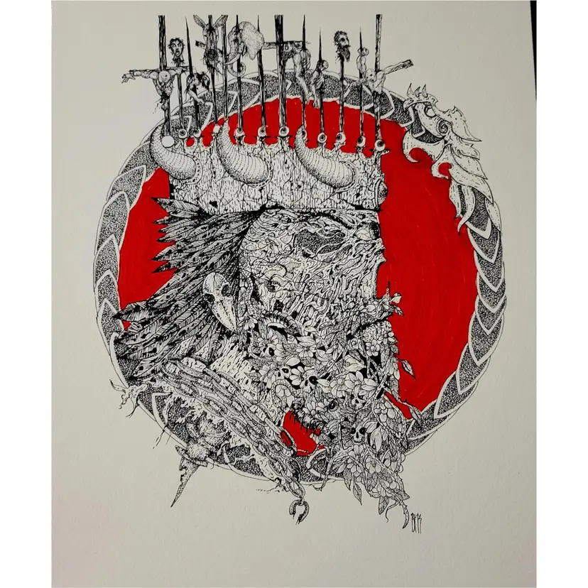 Bfkworks is Brad Kopman, a dark surrealist based in the Philadelphia,PA. area USA. Brad studied art at Hussain School of Art in Philadelphia from 1992-1996. He works in pen & ink on paper as well as Acrylic on Canvas. The works are inspired by a wide range of influences. Music, movies, pop culture, art , religions, nightmares, day dreams, mythologies , legends, authors , emotions , life and death. Often Brad combines beauty and horrors, attraction and disgust. His work has been called paradigm shifting, mind altering views into a parallel universe. Showing the viewer something familiar from a new view point.
