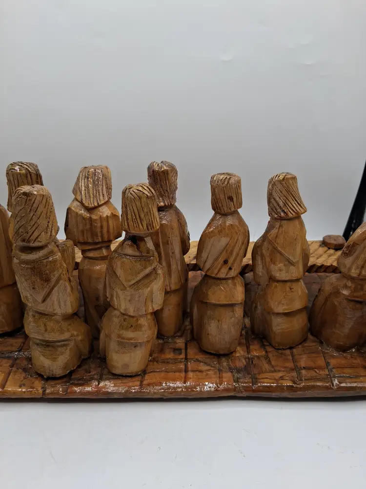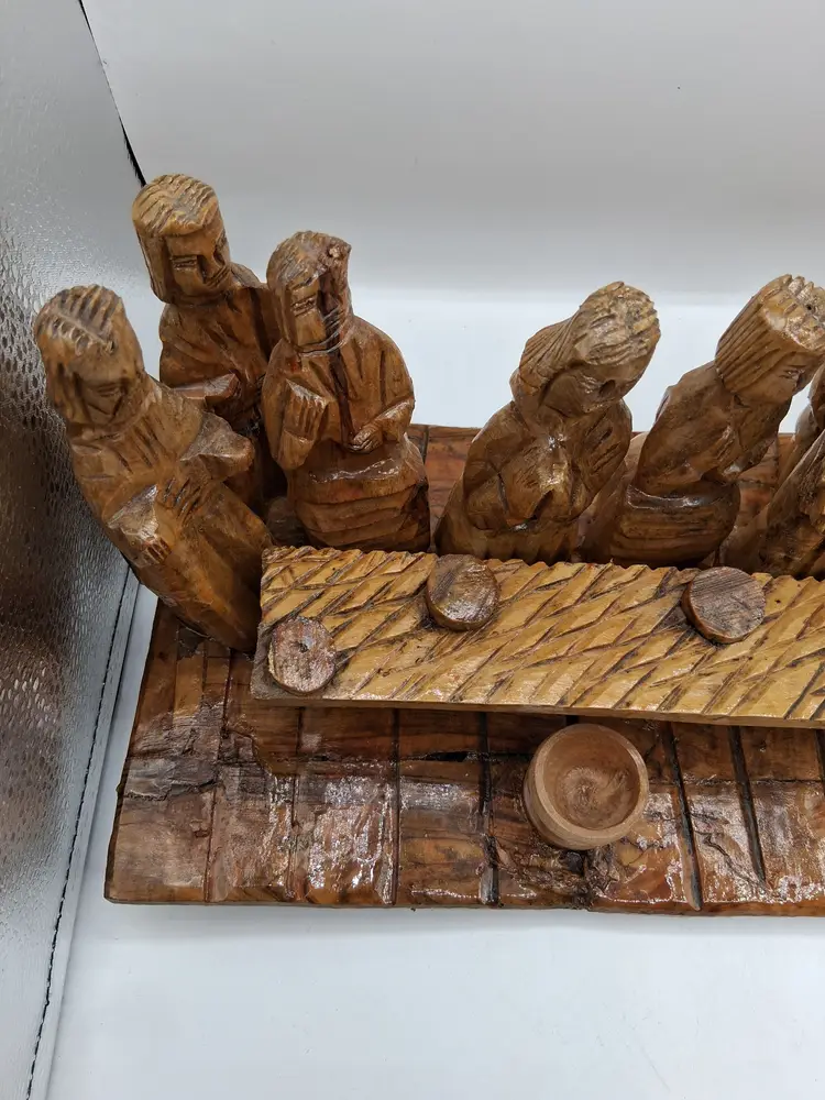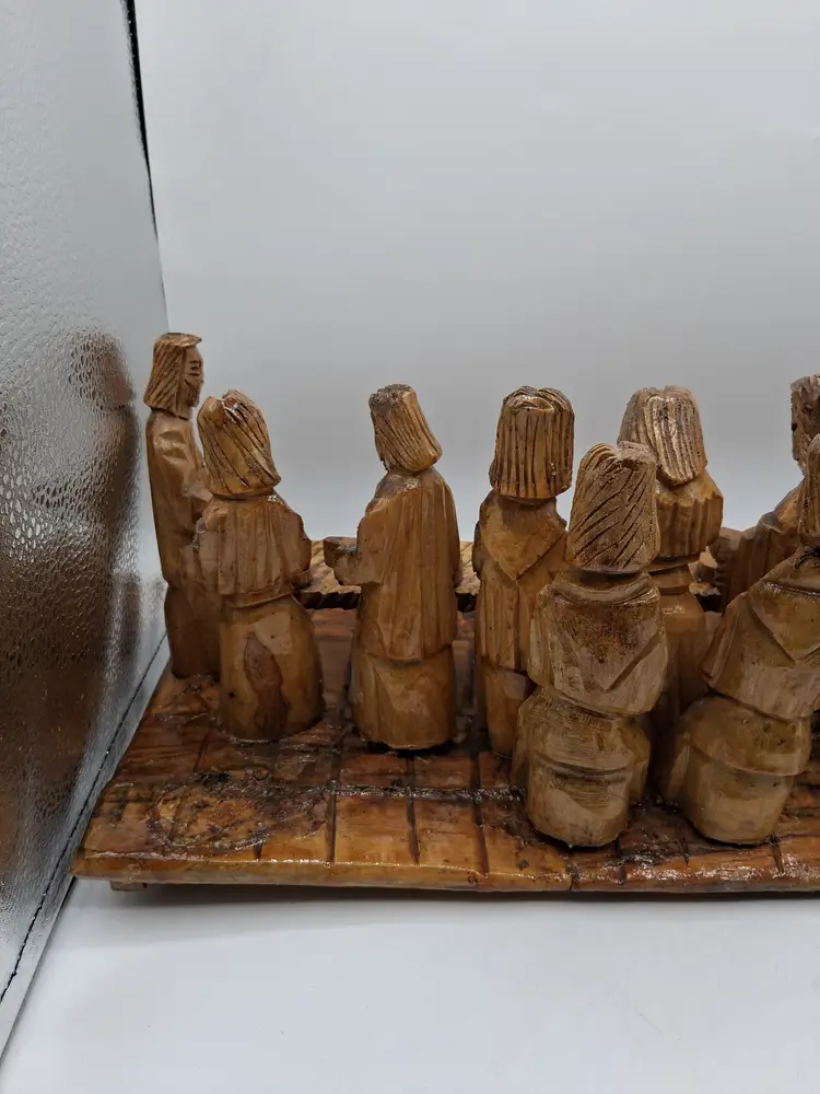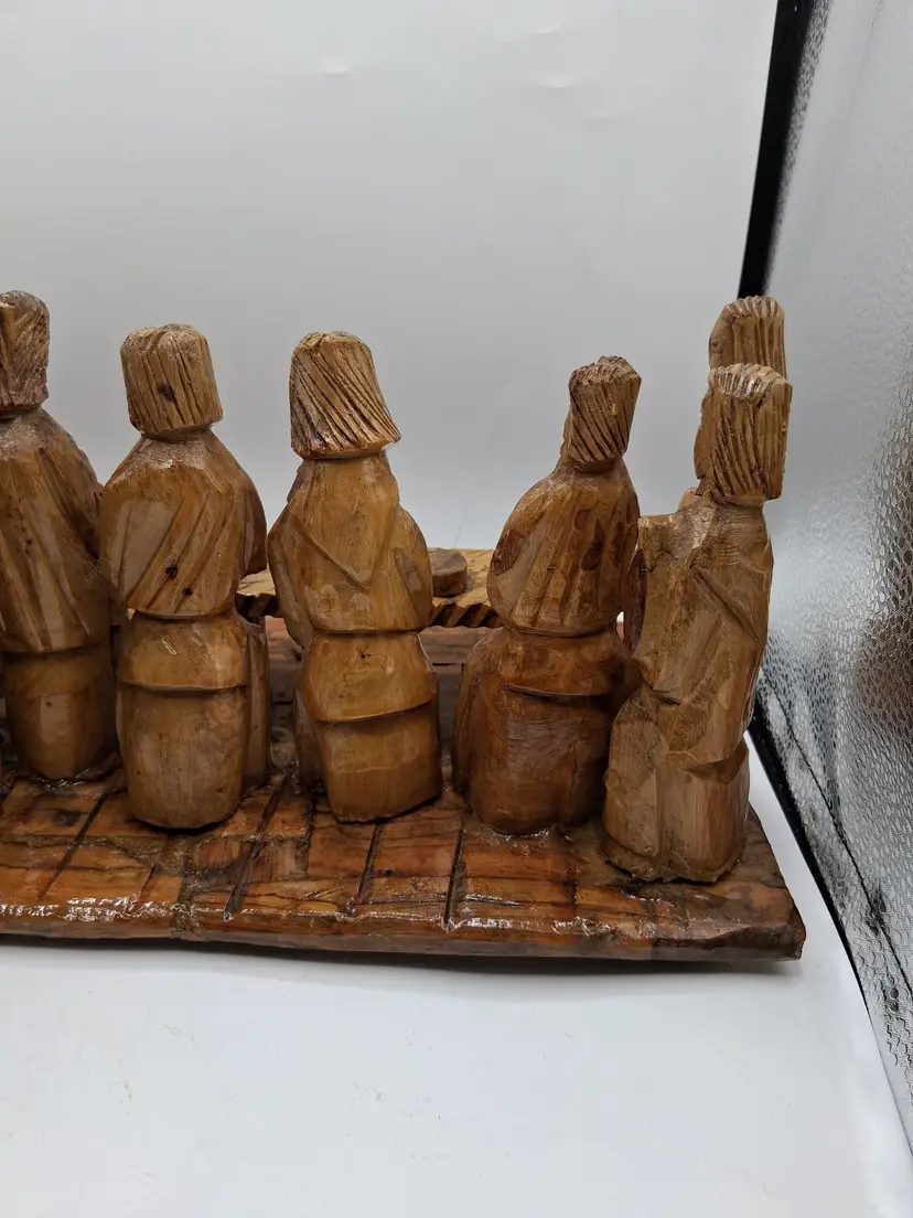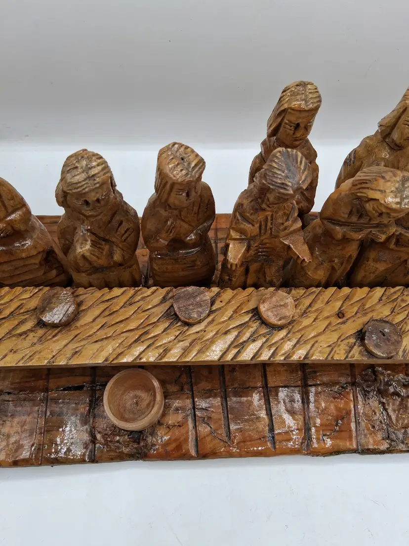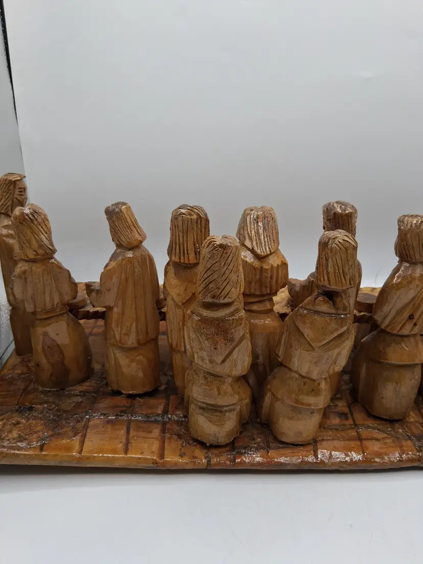 Gorgeous sculpted wood depiction of Jesus and his 12 Disciples at The Last Supper. Folk Art look. One-Of-A-Kind!! Carved from Olive Tree Wood from The Holy Land!!! Measures 17.5" long and 7.0" wide. Great cond!!
