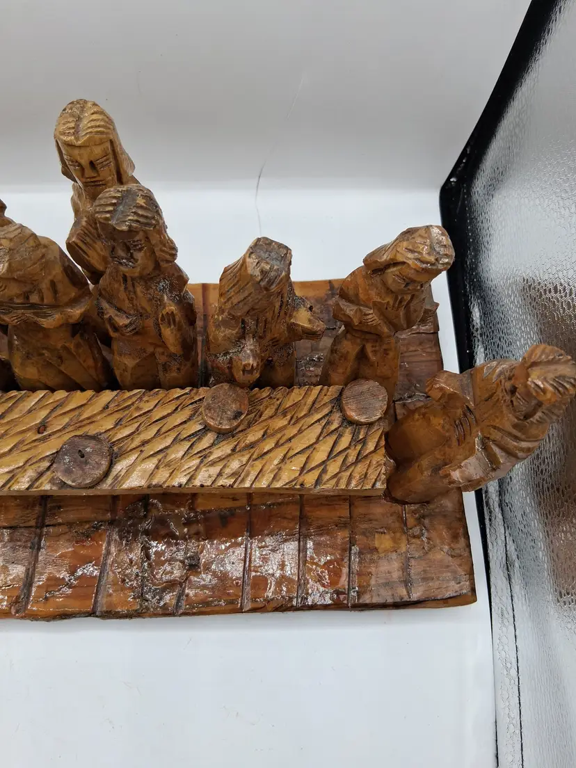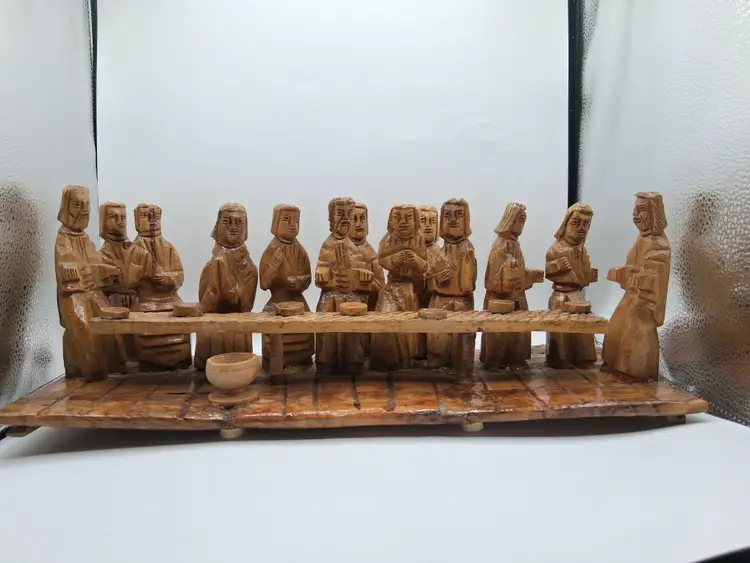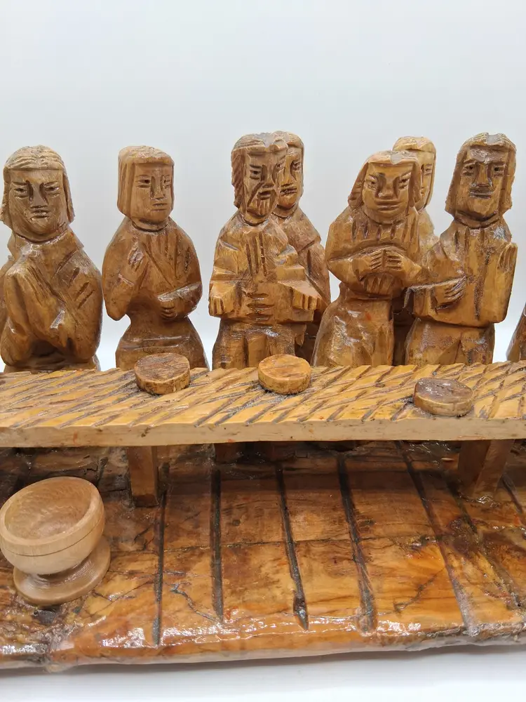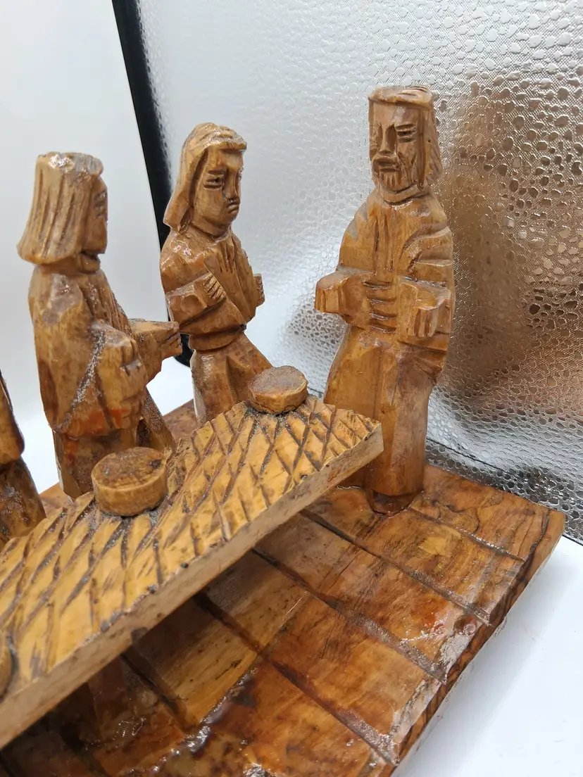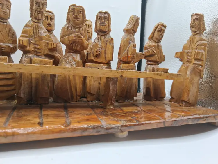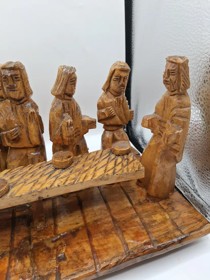 Gorgeous sculpted wood depiction of Jesus and his 12 Disciples at The Last Supper. Folk Art look. One-Of-A-Kind!! Carved from Olive Tree Wood from The Holy Land!!! Measures 17.5" long and 7.0" wide. Great cond!!