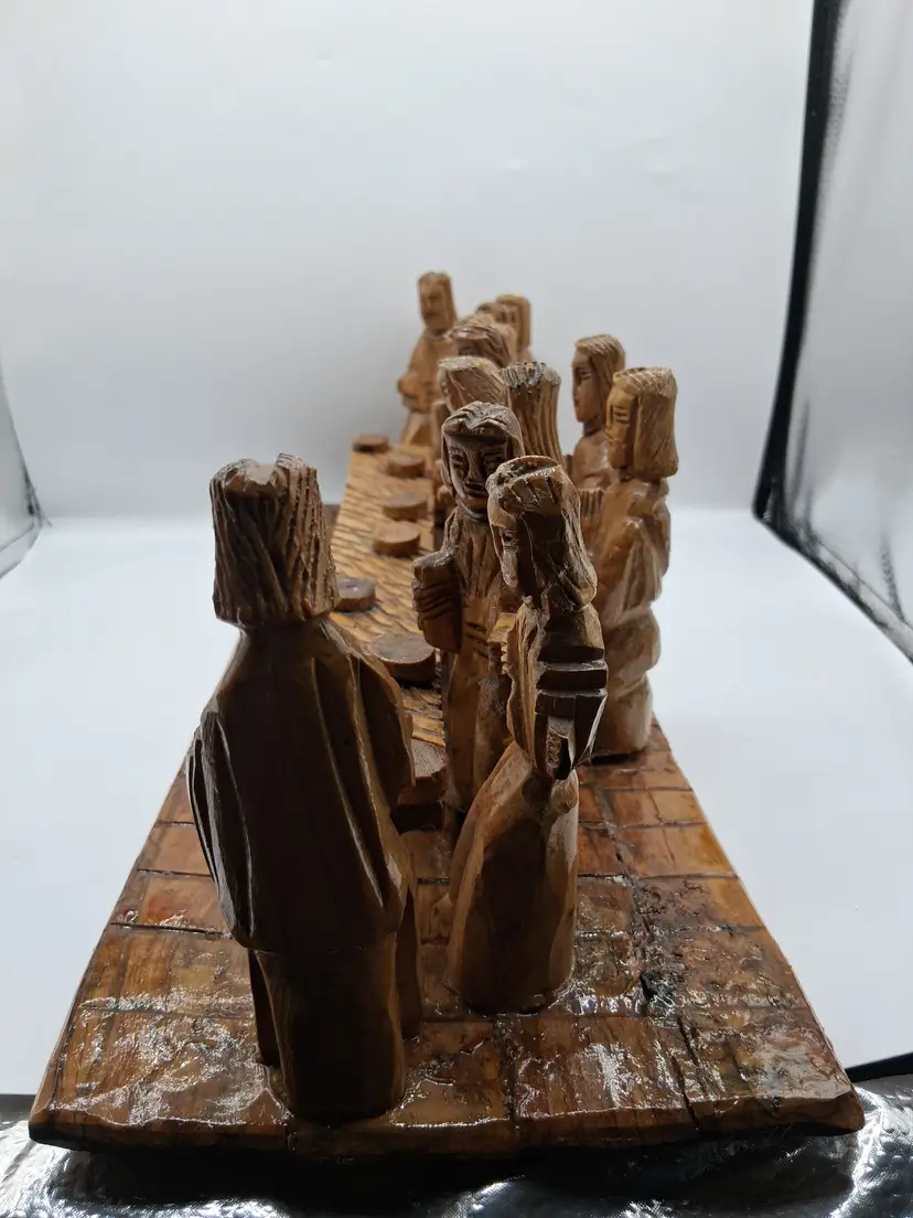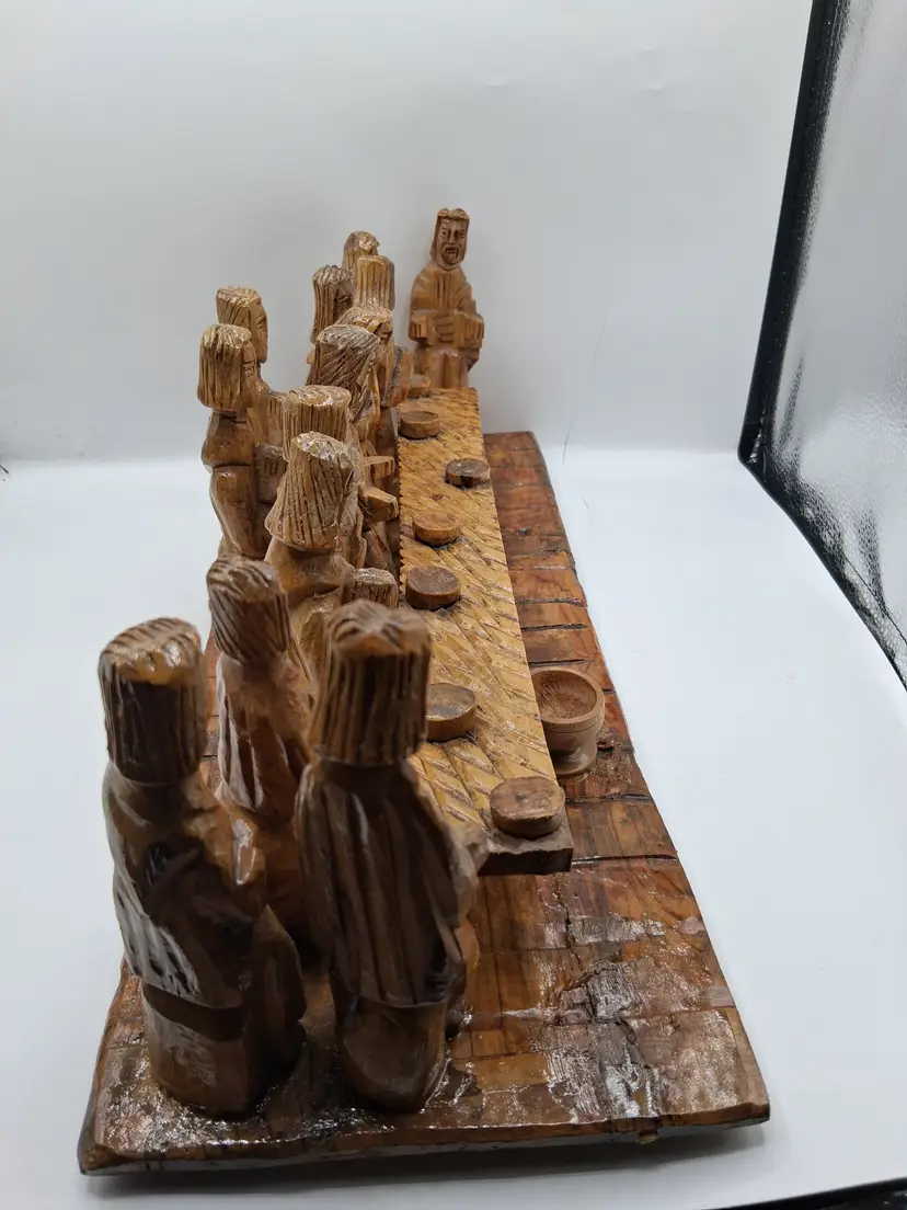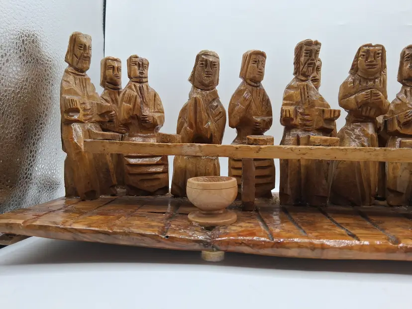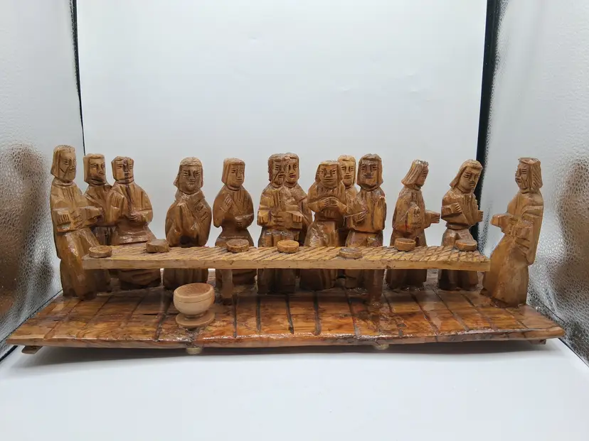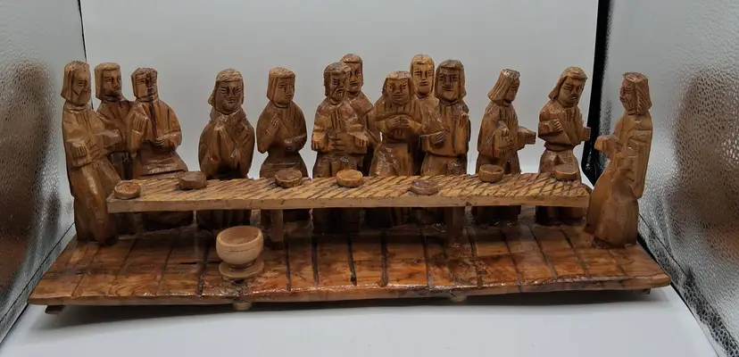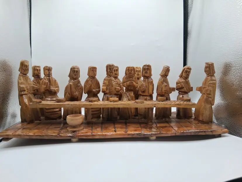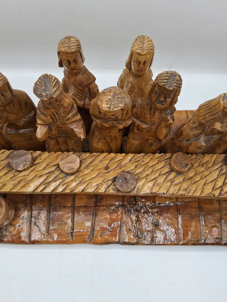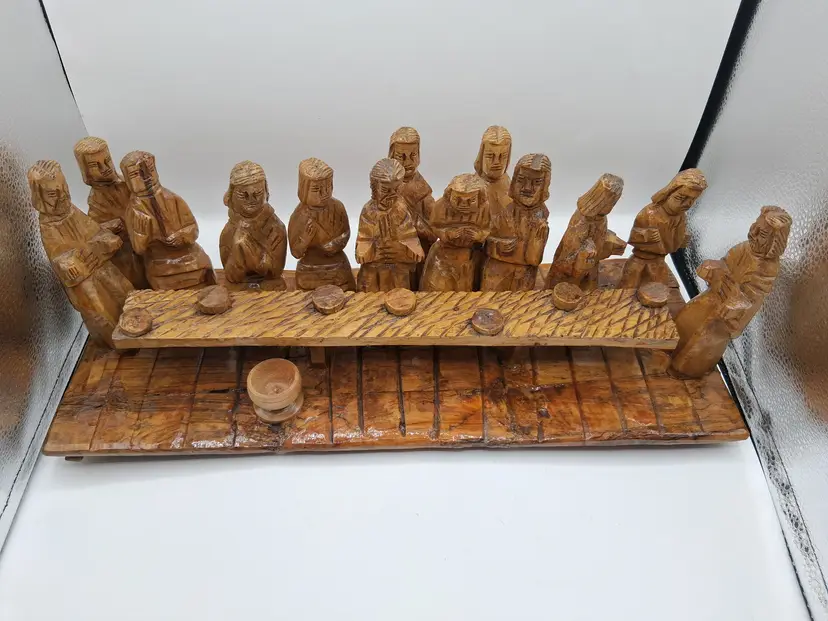 Gorgeous sculpted wood depiction of Jesus and his 12 Disciples at The Last Supper. Folk Art look. One-Of-A-Kind!! Carved from Olive Tree Wood from The Holy Land!!! Measures 17.5" long and 7.0" wide. Great cond!!