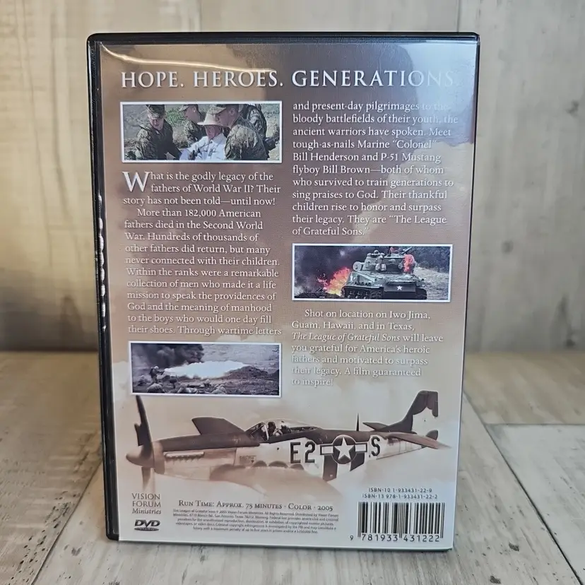 Item Description: A powerful, true story from the Faith of Our Fathers project. "The League of Grateful Sons" explores the heroic legacy of American fathers who fought and died in World War II — and the generations of sons who honor them. Featuring testimonies, battlefield visits, and gripping archival footage from Iwo Jima, Guam, Hawaii, and Texas. Includes accounts from tough-as-nails Marine “Colonel” Bill Henderson and P-51 Mustang flyboy Bill Brown.