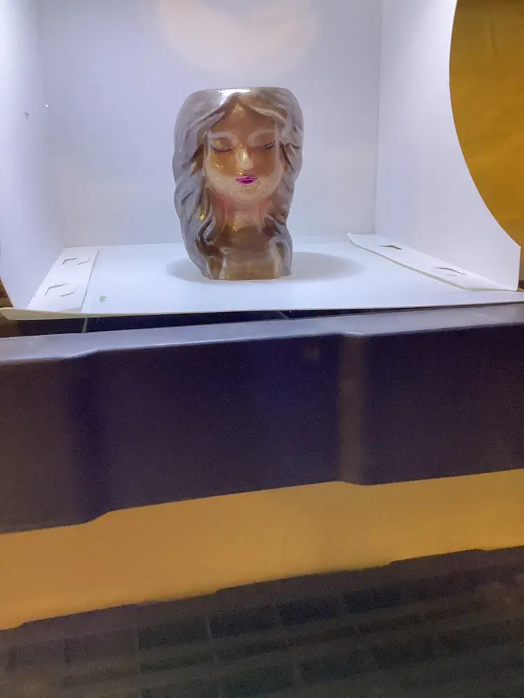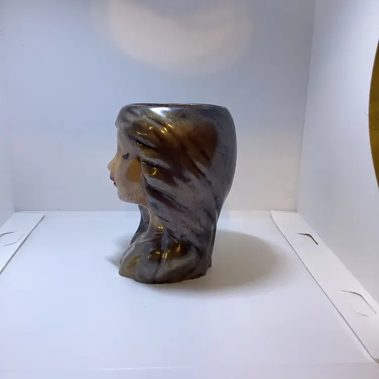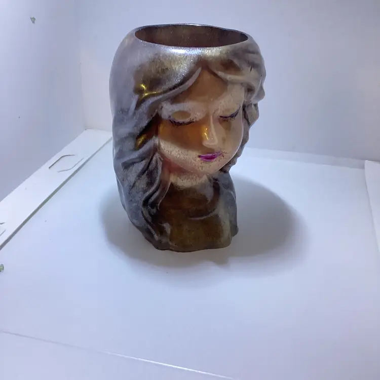 She is 3” tall, and 2” wide, snd 2 1/2” depth. She is made of resin, she has black hair with gold highlights. It can also be used as a candle holder.