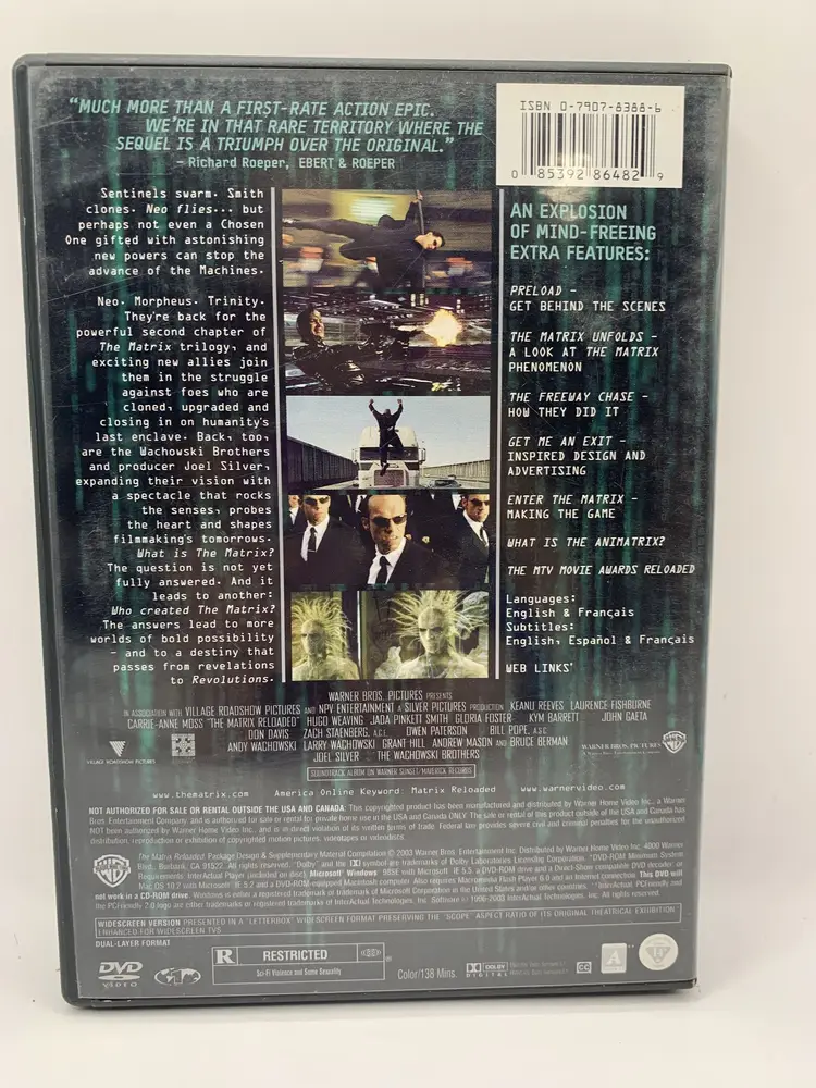 In the second chapter of the Matrix Trilogy Neo (Keanu Reeves) Trinity (Carrie-Anne Moss) and Morpheus (Laurence Fishburne) continue to lead the revolt against the Machine Army. In their quest to save the human race from extinction they gain greater insight into the construct of the Matrix and Neo s pivotal role in the fate of mankind. Direction: Andy Wachowski Larry Wachowski. Actors: Carrie Anne Moss Hugo Weaving Keanu Reeves Laurence Fishburne. Special Features Web links; Preload The Freeway Chase Enter the Matrix What is the Matrix The Matrix Unfolds and Get Me An Exit Documentaries. Year: 2002 Runtime: 138 minutes Original Language: English Subtitles Available: English French Spanish.Size: Unisex OS