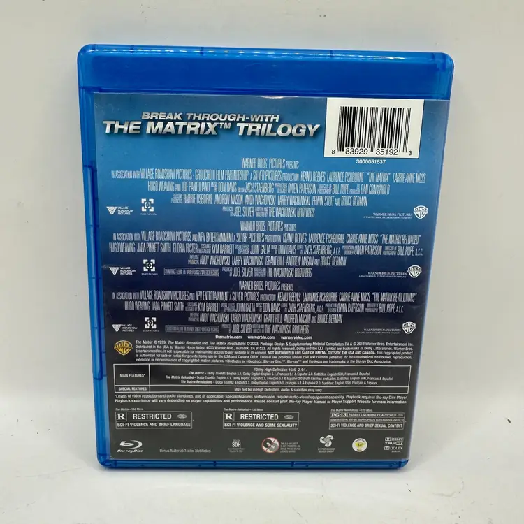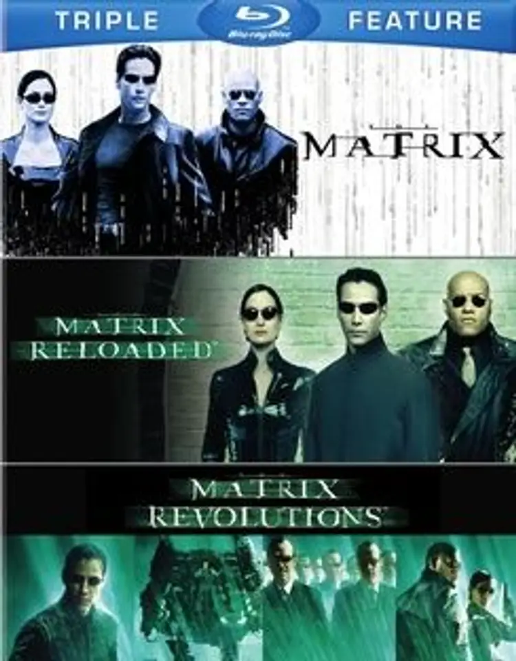 Set includes all three films in The Matrix trilogy. THE MATRIX MATRIX REVOLUTIONS Neo. Trinity. Morpheus. They and other heroes stand on the brink of victory or annihilation in the epic war against the Machines in the stunning final chapter of The Matrix trilogy. For Neo, that means going where no human has dared – into the heart of Machine City and into a cataclysmic showdown with the exponentially more powerful renegade program Smith. For writer-directors the Wachowskis and producer Joel Silver, that means soaring beyond the amazing visual inventiveness of the first two films. The revolutions is now: The Matrix Revolutions. Perception: Our day-in, day-out world is real. Reality: That world is a hoax, an elaborate deception spun by all-powerful machines of artificial intelligence that controls us. Keanu Reeves and Laurence Fishburne lead the fight to free humankind in the see-and-see-again cyberthriller written and directed by the Wachowskis. MATRIX RELOADED In the second chapter of the Matrix trilogy, Neo (Keanu Reeves), Trinity (Carrie-Anne Moss) and Morpheus (Laurence Fishburne) continue to lead the revolt against the Machine Army. In their quest to save the human race from extinction, they gain greater insight into the construct of The Matrix and Neo's pivotal role in the fate of mankind.